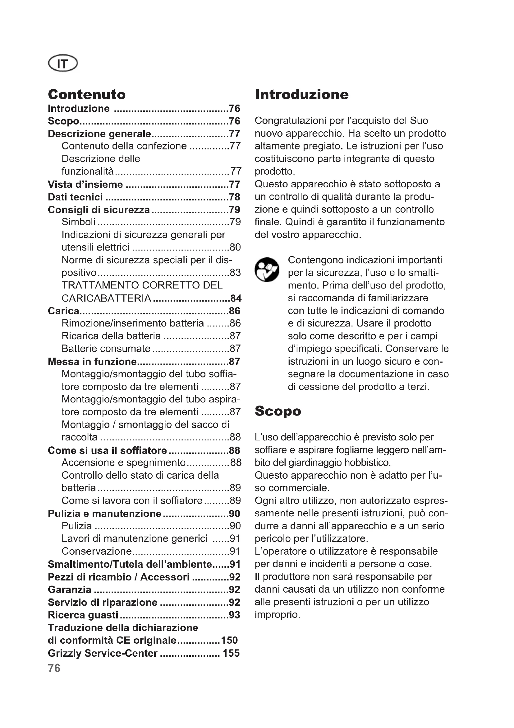 - Introduzione Congratulazioni per l’acquisto del Suo nuovo apparecchio. Ha scelto un prodotto altamente pregiato. Le istruzioni per l’uso costituiscono parte integrante di questo prodotto. Questo apparecchio è stato sottoposto a un controllo di qualità durante la produ- zione e quindi sottoposto a un controllo nale. Quindi è garantito il funzionamento del vostro apparecchio. Contengono indicazioni importanti per la sicurezza, l’uso e lo smalti- mento. Prima dell’uso del prodotto, si raccomanda di familiarizzare con tutte le indicazioni di comando e di sicurezza. Usare il prodotto solo come descritto e per i campi d’impiego specicati. Conservare le istruzioni in un luogo sicuro e con- segnare la documentazione in caso di cessione del prodotto a terzi. Scopo L’uso dell’apparecchio è previsto solo per soare e aspirare fogliame leggero nell’am- bito del giardinaggio hobbistico. Questo apparecchio non è adatto per l’u- so commerciale. Ogni altro utilizzo, non autorizzato espres- samente nelle presenti istruzioni, può con- durre a danni all’apparecchio e a un serio pericolo per l’utilizzatore. L’operatore o utilizzatore è responsabile per danni e incidenti a persone o cose. Il produttore non sarà responsabile per danni causati da un utilizzo non conforme alle presenti istruzioni o per un utilizzo improprio. Traduzione della dichiarazione di conformità CE originale p. 150