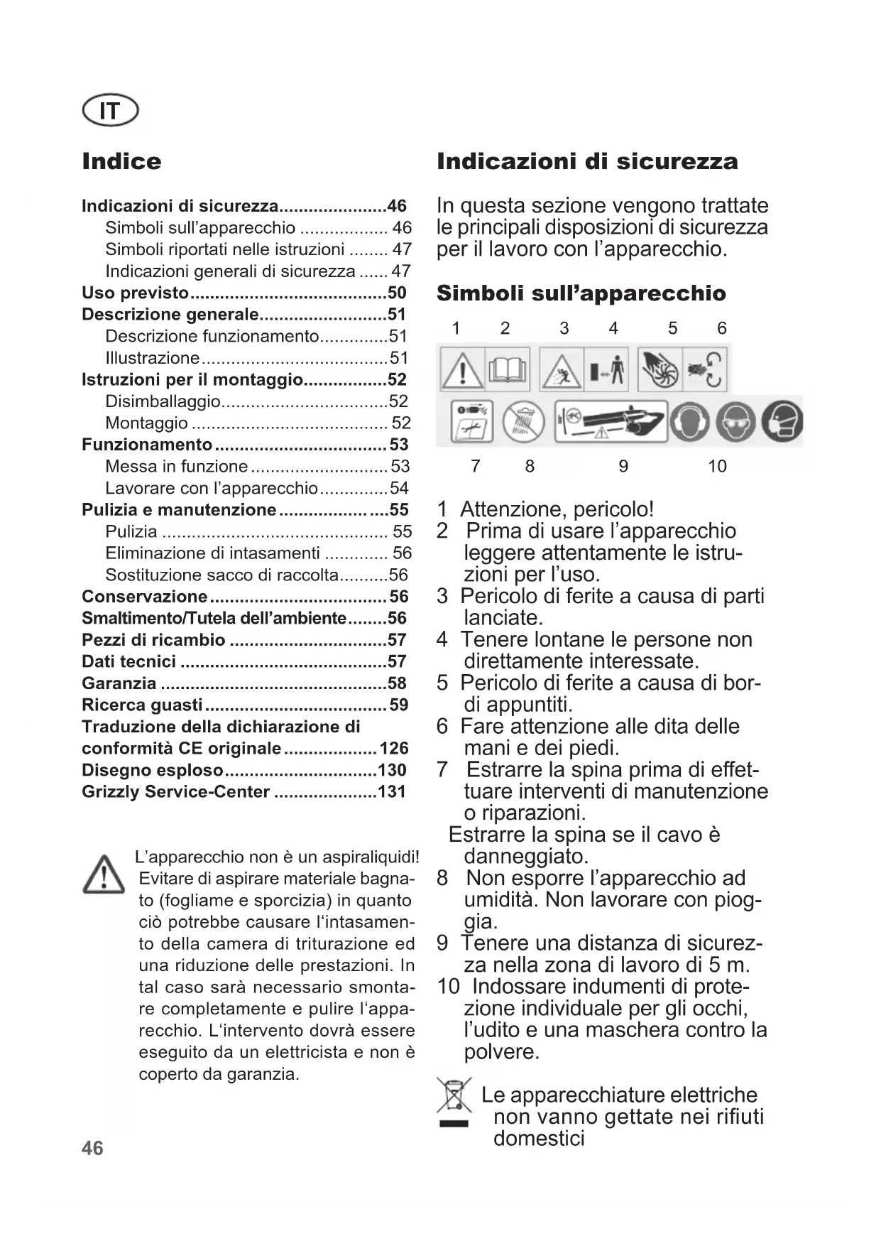 - 1 Attenzione, pericolo! 2 Prima di usare l’apparecchio leggere attentamente le istru- zioni per l’uso. 3 Pericolo di ferite a causa di parti lanciate. 4 Tenere lontane le persone non direttamente interessate. 5 Pericolo di ferite a causa di bor- di appuntiti. 6 Fare attenzione alle dita delle mani e dei piedi. 7 Estrarre la spina prima di eet- tuare interventi di manutenzione o riparazioni. Estrarre la spina se il cavo è danneggiato. 8 Non esporre l’apparecchio ad umidità. Non lavorare con piog- gia. 9 Tenere una distanza di sicurez- za nella zona di lavoro di 5 m. 10 Indossare indumenti di prote- zione individuale per gli occhi, l’udito e una maschera contro la polvere. Le apparecchiature elettriche non vanno gettate nei riuti domestici L’apparecchio non è un aspiraliquidi! Evitare di aspirare materiale bagna- to (fogliame e sporcizia) in quanto ciò potrebbe causare l‘intasamen- to della camera di triturazione ed una riduzione delle prestazioni. In tal caso sarà necessario smonta- re completamente e pulire l‘appa- recchio. L‘intervento dovrà essere eseguito da un elettricista e non è coperto da garanzia. Indice Indicazioni di sicurezza p. 46