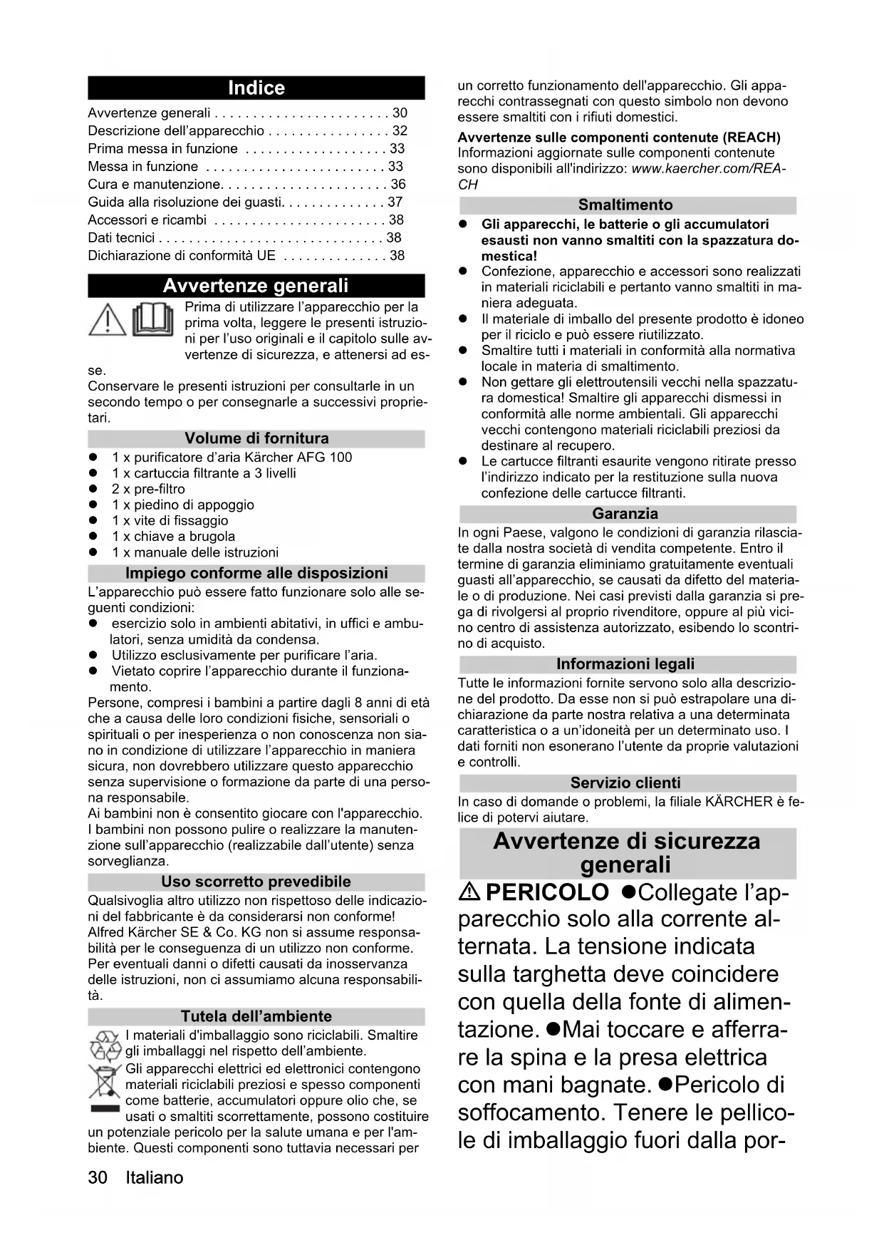 dB(A) 37 - 65 Poids kg 13 Hauteur mm 1120 Diamètre de la plaque de pied mm 320 Température ambiante °C 10 - 30 Humidité de l'air relative % 20 - 80 Chairman of the Board of ManagementDirector Regulatory Affairs & Certification H. Jenner S. Reiser30 Italiano Indice Avvertenze generali Prima di utilizzare l’apparecchio per la prima volta, leggere le presenti istruzio- ni per l’uso originali e il capitolo sulle av- vertenze di sicurezza, e attenersi ad es- se. Conservare le presenti istruzioni per consultarle in un secondo tempo o per consegnarle a successivi proprie- tari. Volume di fornitura 1 x purificatore d’aria Kärcher AFG 100 1 x cartuccia filtrante a 3 livelli 2 x pre-filtro 1 x piedino di appoggio 1 x vite di fissaggio 1 x chiave a brugola 1 x manuale delle istruzioni Impiego conforme alle disposizioni L’apparecchio può essere fatto funzionare solo alle se- guenti condizioni: esercizio solo in ambienti abitativi, in uffici e ambu- latori, senza umidità da condensa. Utilizzo esclusivamente per purificare l’aria. Vietato coprire l’apparecchio durante il funziona- mento. Persone, compresi i bambini a partire dagli 8 anni di età che a causa delle loro condizioni fisiche, sensoriali o spirituali o per inesperienza o non conoscenza non sia- no in condizione di utilizzare l’apparecchio in maniera sicura, non dovrebbero utilizzare questo apparecchio senza supervisione o formazione da parte di una perso- na responsabile. Ai bambini non è consentito giocare con l'apparecchio. I bambini non possono pulire o realizzare la manuten- zione sull’apparecchio (realizzabile dall’utente) senza sorveglianza. Uso scorretto prevedibile Qualsivoglia altro utilizzo non rispettoso delle indicazio- ni del fabbricante è da considerarsi non conforme! Alfred Kärcher SE & Co. KG non si assume responsa- bilità per le conseguenza di un utilizzo non conforme. Per eventuali danni o difetti causati da inosservanza delle istruzioni, non ci assumiamo alcuna responsabili- tà. Tutela dell’ambiente I materiali d'imballaggio sono riciclabili. Smaltire gli imballaggi nel rispetto dell’ambiente. Gli apparecchi elettrici ed elettronici contengono materiali riciclabili preziosi e spesso componenti come batterie, accumulatori oppure olio che, se usati o smaltiti scorrettamente, possono costituire un potenziale pericolo per la salute umana e per l'am- biente. Questi componenti sono tuttavia necessari per un corretto funzionamento dell'apparecchio. Gli appa- recchi contrassegnati con questo simbolo non devono essere smaltiti con i rifiuti domestici. Avvertenze sulle componenti contenute (REACH) Informazioni aggiornate sulle componenti contenute sono disponibili all'indirizzo: www.kaercher.com/REA-