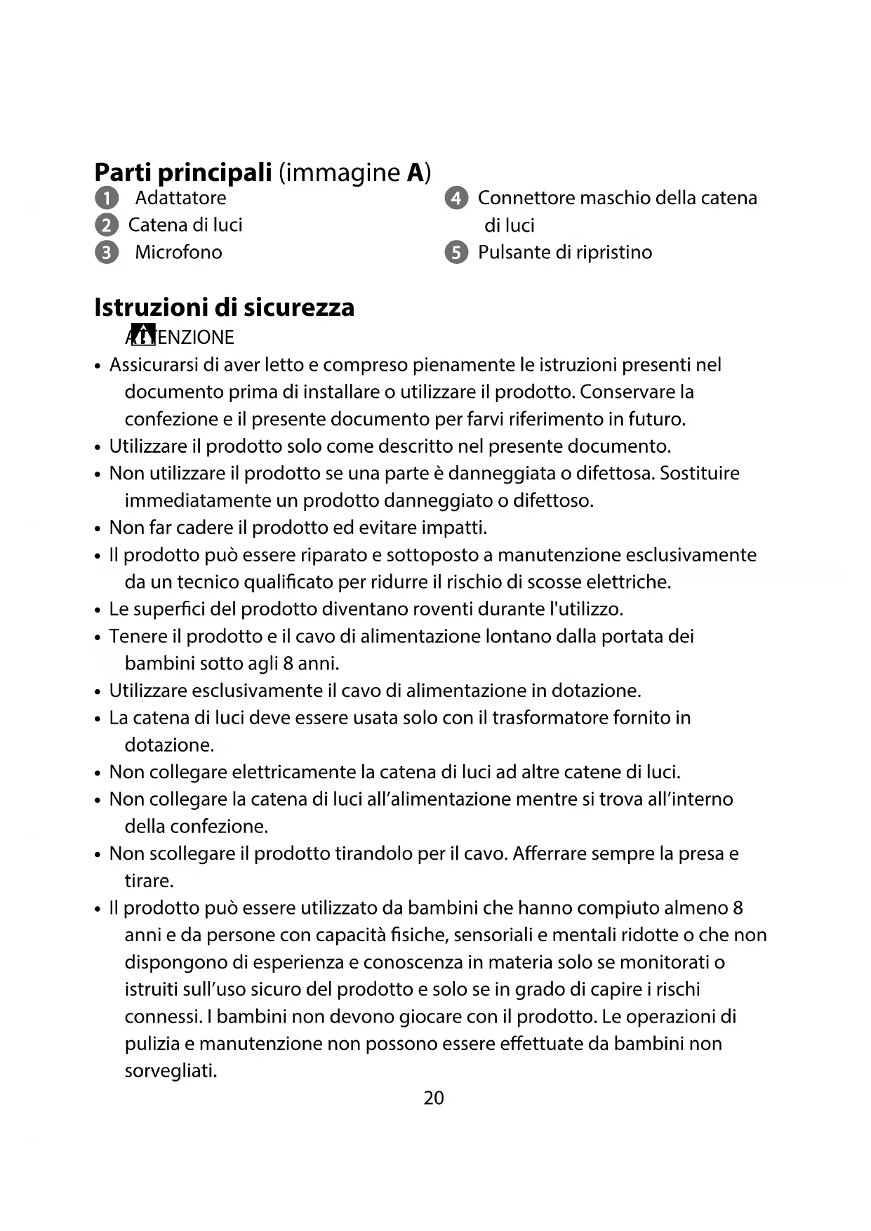 WIFILX01C168 Per maggiori informazioni vedere il manuale esteso online: ned.is/wilx01c42 | ned.is/wilx01c84 | ned.is/wilx01c168 Uso previsto Il prodotto è una catena di luci intelligente a luce colorata, intesa per illuminare ambienti interni ed esterni, che può essere controllata usando l’app Nedis SmartLife. Conservare la scheda di garanzia, la ricevuta di acquisto e il manuale d’uso nella stessa confezione originale per un consulto futuro. Questo prodotto è inteso per utilizzo in interni e in esterni. Non lasciare che persone con capacità siche, sensoriali o mentali ridotte o mancanza di esperienza e conoscenza utilizzino il prodotto. I bambini devono essere sottoposti a supervisione per assicurarsi che non giochino con il prodotto. Il prodotto non è inteso per l’utilizzo tramite timer esterno o sistema di controllo a distanza separato.20 Parti principali (immagine A) 1 Adattatore 2 Catena di luci 3 Microfono 4 Connettore maschio della catena di luci 5 Pulsante di ripristino Istruzioni di sicurezza