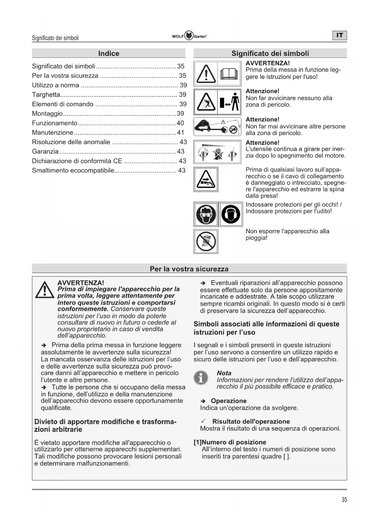 UHFFKLRLOSLSRVVLELOHHFDFHHSUDWLFR Î Operazione Indica un’operazione da svolgere. 3 Risultato dell'operazione Mostra il risultato di una sequenza di operazioni. [1]Numero di posizione All’interno del testo i numeri di posizione sono inseriti tra parentesi quadre [ ]. 6LJQL¿FDWRGHLVLPEROL ............................................ 35 Per la vostra sicurezza .......................................... 35 Utilizzo a norma ..................................................... 39 Targhetta................................................................ 39 Elementi di comando ............................................. 39 Montaggio .............................................................. 39 Funzionamento ...................................................... Manutenzione ........................................................ 41 Risoluzione delle anomalie .................................... 43 Garanzia ................................................................ 43 Dichiarazione di conformità CE ............................. 43 Smaltimento ecocompatibile.................................. 43 Per la vostra sicurezza 6LJQL¿FDWRGHLVLPEROL AVVERTENZA! Prima della messa in funzione leg- gere le istruzioni per l'uso! Attenzione! Non far avvicinare nessuno alla zona di pericolo. 360° Attenzione! Non far mai avvicinare altre persone alla zona di pericolo. Attenzione! L'utensile continua a girare per iner- zia dopo lo spegnimento del motore. Prima di qualsiasi lavoro sull’appa- recchio o se il cavo di collegamento è danneggiato o intrecciato, spegne- re l'apparecchio ed estrarre la spina dalla presa! Indossare protezioni per gli occhi! / Indossare protezioni per l'udito! Non esporre l'apparecchio alla pioggia! IndicePer la vostra sicurezza