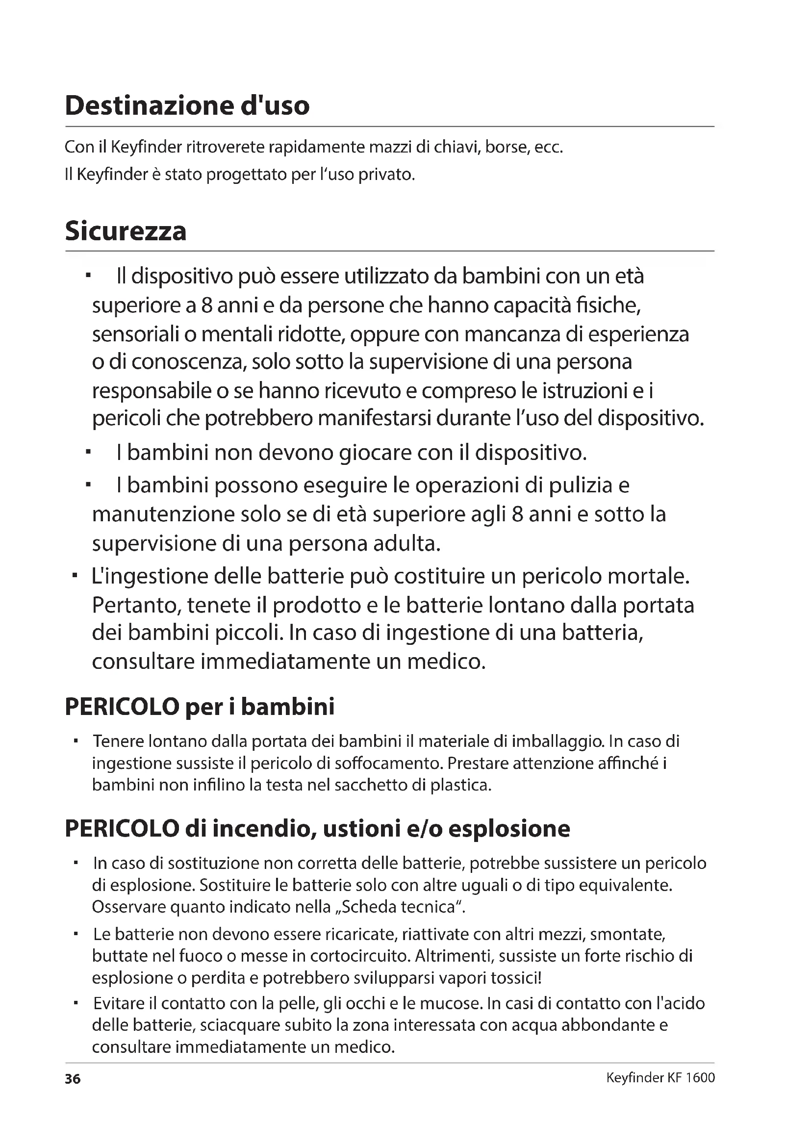Keyfinder KF 1600 Destinazione d'uso Con il Keyfinder ritroverete rapidamente mazzi di chiavi, borse, ecc. Il Keyfinder è stato progettato per l‘uso privato. Sicurezza Il dispositivo può essere utilizzato da bambini con un età superiore a 8 anni e da persone che hanno capacità siche, sensoriali o mentali ridotte, oppure con mancanza di esperienza o di conoscenza, solo sotto la supervisione di una persona responsabile o se hanno ricevuto e compreso le istruzioni e i pericoli che potrebbero manifestarsi durante l’uso del dispositivo. I bambini non devono giocare con il dispositivo. I bambini possono eseguire le operazioni di pulizia e manutenzione solo se di età superiore agli 8 anni e sotto la supervisione di una persona adulta. L'ingestione delle batterie può costituire un pericolo mortale. Pertanto, tenete il prodotto e le batterie lontano dalla portata dei bambini piccoli. In caso di ingestione di una batteria, consultare immediatamente un medico. PERICOLO per i bambini Tenere lontano dalla portata dei bambini il materiale di imballaggio. In caso di ingestione sussiste il pericolo di soocamento. Prestare attenzione anché i bambini non inlino la testa nel sacchetto di plastica. PERICOLO di incendio, ustioni e/o esplosione In caso di sostituzione non corretta delle batterie, potrebbe sussistere un pericolo di esplosione. Sostituire le batterie solo con altre uguali o di tipo equivalente. Osservare quanto indicato nella „Scheda tecnica“. Le batterie non devono essere ricaricate, riattivate con altri mezzi, smontate, buttate nel fuoco o messe in cortocircuito. Altrimenti, sussiste un forte rischio di esplosione o perdita e potrebbero svilupparsi vapori tossici! Evitare il contatto con la pelle, gli occhi e le mucose. In casi di contatto con l'acido delle batterie, sciacquare subito la zona interessata con acqua abbondante e consultare immediatamente un medico. Druckbuch Key Finder.indb 36 20.04.2016 14:38:47Sicurezza