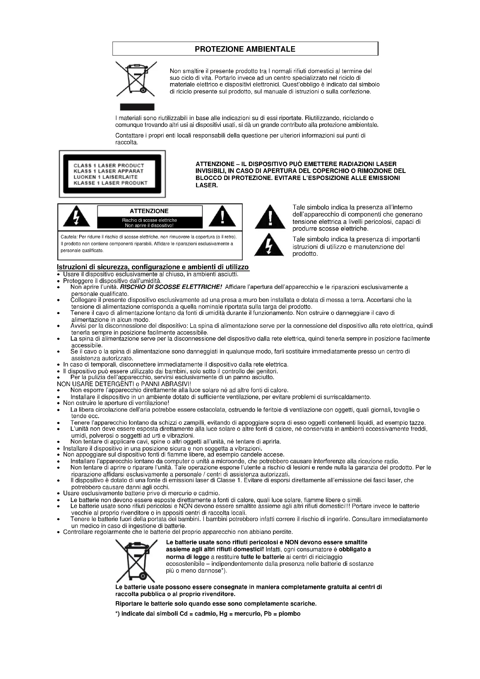Tale simbolo indica la presenza di importanti istruzioni di utilizzo e manutenzione del prodotto. Istruzioni di sicurezza, configurazione e ambienti di utilizzo Usare il dispositivo esclusivamente al chiuso, in ambienti asciutti. Proteggere il dispositivo dall’umidità. Non aprire l’unità. RISCHIO DI SCOSSE ELETTRICHE! Affidare l’apertura dell’apparecchio e le riparazioni esclusivamente a personale qualificato. Collegare il presente dispositivo esclusivamente ad una presa a muro ben installata e dotata di messa a terra. Accertarsi che la tensione di alimentazione corrisponda a quella nominale riportata sulla targa del prodotto. Tenere il cavo di alimentazione lontano da fonti di umidità durante il funzionamento. Non ostruire o danneggiare il cavo di alimentazione in alcun modo. Avvisi per la disconnessione del dispositivo: La spina di alimentazione serve per la connessione del dispositivo alla rete elettrica, quindi tenerla sempre in posizione facilmente accessibile. La spina di alimentazione serve per la disconnessione del dispositivo dalla rete elettrica, quindi tenerla sempre in posizione facilmente accessibile. Se il cavo o la spina di alimentazione sono danneggiati in qualunque modo, farli sostituire immediatamente presso un centro di assistenza autorizzato. In caso di temporali, disconnettere immediatamente il dispositivo dalla rete elettrica. Il dispositivo può essere utilizzato dai bambini, solo sotto il controllo dei genitori. Per la pulizia dell’apparecchio, servirsi esclusivamente di un panno asciutto. NON USARE DETERGENTI o PANNI ABRASIVI! Non esporre l’apparecchio direttamente alla luce solare né ad altre fonti di calore. Installare il dispositivo in un ambiente dotato di sufficiente ventilazione, per evitare problemi di surriscaldamento. Non ostruire le aperture di ventilazione! La libera circolazione dell’aria potrebbe essere ostacolata, ostruendo le feritoie di ventilazione con oggetti, quali giornali, tovaglie o tende ecc. Tenere l’apparecchio lontano da schizzi o zampilli, evitando di appoggiare sopra di esso oggetti contenenti liquidi, ad esempio tazze. L’unità non deve essere esposta direttamente alla luce solare o altre fonti di calore, né conservata in ambienti eccessivamente freddi, umidi, polverosi o soggetti ad urti e vibrazioni. Non tentare di applicare cavi, spine o altri oggetti all’unità, né tentare di aprirla. Installare il dispositivo in una posizione sicura e non soggetta a vibrazioni. Non appoggiare sul dispositivo fonti di fiamme libere, ad esempio candele accese. Installare l’apparecchio lontano da computer o unità a microonde, che potrebbero causare interferenze alla ricezione radio. Non tentare di aprire o riparare l’unità. Tale operazione espone l’utente a rischio di lesioni e rende nulla la garanzia del prodotto. Per le riparazione affidarsi esclusivamente a personale / centri di assistenza autorizzati. Il dispositivo è dotato di una fonte di emissioni laser di Classe 1. Evitare di esporsi direttamente all’emissione dei fasci laser, che potrebbero causare danni agli occhi. Usare esclusivamente batterie prive di mercurio e cadmio. Le batterie non devono essere esposte direttamente a fonti di calore, quali luce solare, fiamme libere o simili. Le batterie usate sono rifiuti pericolosi e NON devono essere smaltite assieme agli altri rifiuti domestici!!! Portare invece le batterie vecchie al proprio rivenditore o in appositi centri di raccolta locali. Tenere le batterie fuori della portata dei bambini. I bambini potrebbero infatti correre il rischio di ingerirle. Consultare immediatamente un medico in caso di ingestione di batterie. Controllare regolarmente che le batterie del proprio apparecchio non abbiano perdite.