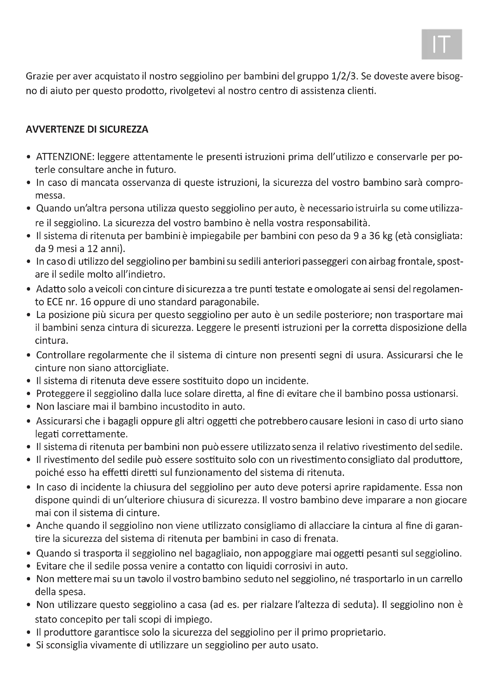 - Il produore garansce solo la sicurezza del seggiolino per il primo proprietario.