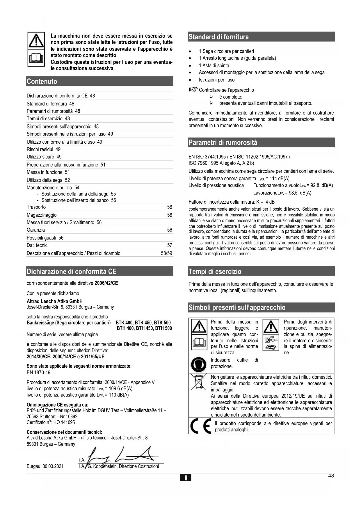 Dichiarazione di conformità CE corrispondentemente alle direttive 2006/42/CE Con la presente dichiariamo Altrad Lescha Atika GmbH Josef-Drexler-Str. 8, 89331 Burgau – Germany sotto la nostra responsabilità che il prodotto Baukreissäge (Sega circolare per cantieri) BTK 400, BTK 450, BTK 500 BTH 400, BTH 450, BTH 500 Numero di serie: vedere ultima pagina è conforme alle disposizioni delle summenzionate Direttive CE, nonché alle disposizioni delle seguenti ulteriori Direttive: 2014/30/CE, 2000/14/CE e 2011/65/UE Sono state applicate le seguenti norme armonizzate: EN 1870-19 Procedura di accertamento di conformità: 2000/14/CE - Appendice V livello di potenza acustica misurato L