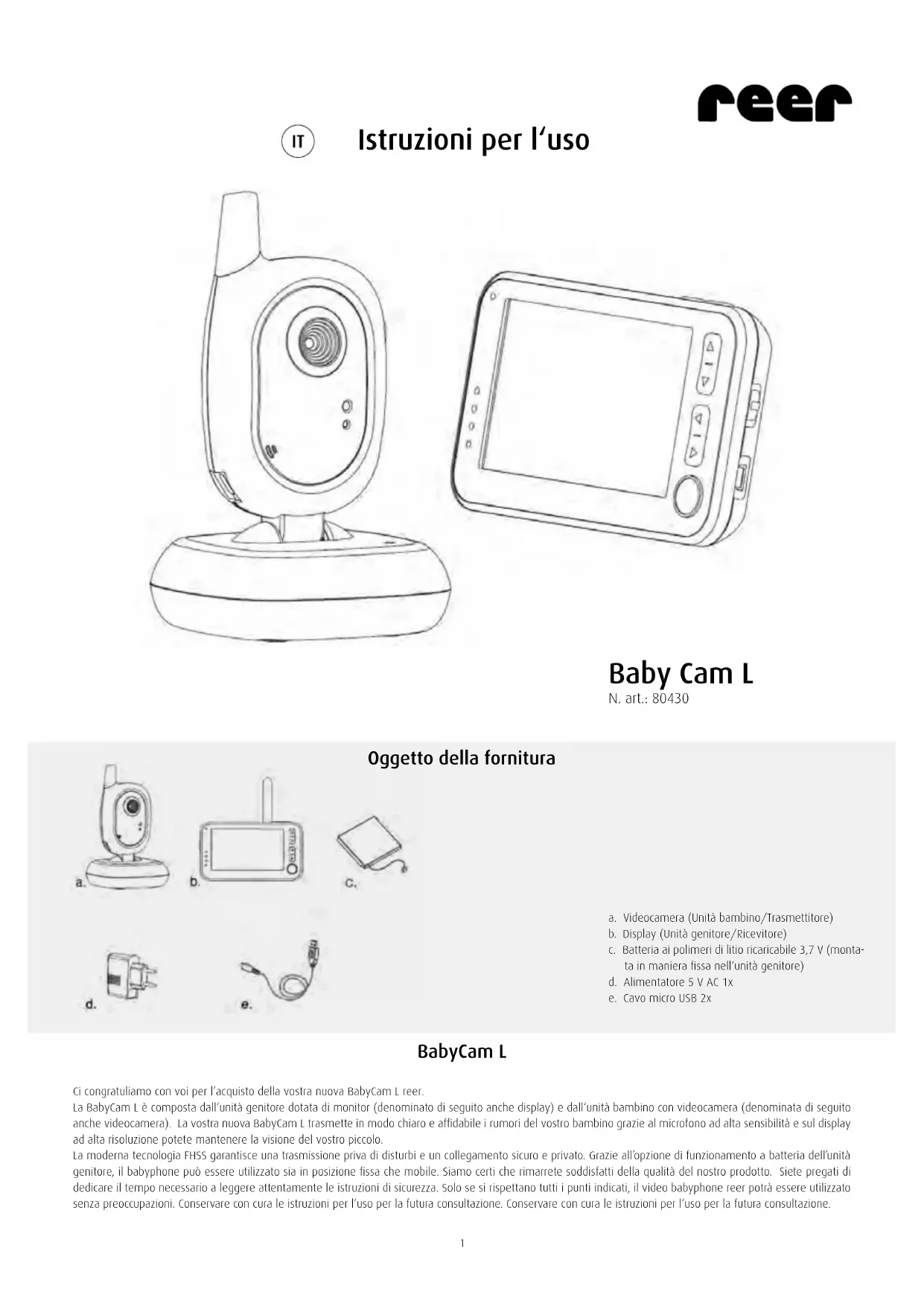 - Repositionnement de la caméra et de l‘écran Résolution des problèmes : 6Istruzioni per l‘uso Oggetto della fornitura BabyCam L Ci congratuliamo con voi per l‘acquisto della vostra nuova BabyCam L reer. La BabyCam L è composta dall‘unità genitore dotata di monitor (denominato di seguito anche display) e dall‘unità bambino con videocamera (denominata di seguito anche videocamera). La vostra nuova BabyCam L trasmette in modo chiaro e affidabile i rumori del vostro bambino grazie al microfono ad alta sensibilità e sul display ad alta risoluzione potete mantenere la visione del vostro piccolo. La moderna tecnologia FHSS garantisce una trasmissione priva di disturbi e un collegamento sicuro e privato. Grazie all’opzione di funzionamento a batteria dell’unità genitore, il babyphone può essere utilizzato sia in posizione fissa che mobile. Siamo certi che rimarrete soddisfatti della qualità del nostro prodotto. Siete pregati di dedicare il tempo necessario a leggere attentamente le istruzioni di sicurezza. Solo se si rispettano tutti i punti indicati, il video babyphone reer potrà essere utilizzato senza preoccupazioni. Conservare con cura le istruzioni per l‘uso per la futura consultazione. Conservare con cura le istruzioni per l‘uso per la futura consultazione. Baby Cam L N. art.: 80430 a. Videocamera (Unità bambino/Trasmettitore) b. Display (Unità genitore/Ricevitore) c. Batteria ai polimeri di litio ricaricabile 3,7 V (monta- ta in maniera fissa nell‘unità genitore) d. Alimentatore 5 V AC 1x e. Cavo micro USB 2x 1Dati tecnici Avvertenze di sicurezza generali ! Prima di ogni utilizzo, verificare l‘eventuale presenza di danni visibili all‘apparecchio. Qualora si dovesse accertare la presenza di danni, l‘apparecchio non deve essere utilizzato. ! Utilizzare esclusivamente i dispositivi di carica e gli alimentatori forniti in dotazione. Assicurarsi che la tensione di esercizio della presa di corrente corrisponda a quella dell‘alimentatore. Verificare, soprattutto quando ci si trova in viaggio all‘estero, che la tensione di rete del luogo corrisponda alla tensione indicata sugli apparecchi o sugli alimentatori. ! Gli apparecchi e gli alimentatori non devono essere aperti, onde evitare il pericolo di scosse elettriche. In caso di funzionamento difettoso di un apparecchio, NON tentare di risolvere autonomamente il problema. In tal caso siete pregati di rivolgervi al vostro rivenditore. ! Evitare che le batterie o i contatti di collegamento elettrico degli apparecchi entrino in contatto con oggetti metallici. ! Questo prodotto non è un giocattolo! Non lasciar che i bambini giochino con l‘apparecchio. ATTENZIONE! Il presente babyphone è destinato esclusivamente a essere utilizzato come aiuto per vigilare sul vostro bambino. Non è un dispositivo medico, né sostituire il dovere di vigilanza dei genitori. Istruzioni di sicurezza per l‘installazione ! Posizionare sempre l‘unità bambino fuori dalla portata del bambino stesso (distanza minima di 1 m). ! Non lasciare mai il babyphone nella culla, o nel lettino, o nel box ! Accertarsi che il cavo di alimentazione si trovi fuori dalla portata dei bambini, onde evitare il rischio di strangolamento. Non utilizzare cavi di prolunga. ! Per garantire una trasmissione ottimale, l‘apparecchio va posizionato sempre in posizione dritta e sollevata. ! NON collocare il ricevitore in prossimità di apparecchi radio o a microonde. L‘irradiazione di tali apparecchi può compromettere fortemente la ricezione ! Non utilizzare gli apparecchi in prossimità di acqua, o in luoghi umidi. Non immergere gli apparecchi in acqua. ! Non sciacquare gli apparecchi con acqua corrente. ! Non coprire il babyphone con asciugamani, vestiti o coperte ! Non esporre l‘apparecchio al calore estremo e ai raggi diretti del sole ! La presa per il collegamento dell‘alimentatore deve trovarsi nei pressi del babyphone e deve essere accessibile in qualsiasi momento. ! Lo scollegamento della rete di alimentazione è garantito solo se l‘alimentatore è staccato dalla presa. Tecnologia FHSS digitale con modulazione FSK Frequenza 2,4 GHz Trasmettitore unità bambino videocamera Alimentazione elettrica con alimentatore Ricevitore unità genitore display Alimentazione elettrica con alimentatore o in opzione con batteria ai polimeri di litio da 3.7 V 1400 mAh/ ricaricabile (montata in maniera fissa nell'unità genitore) Input 100 – 240 V / 50 Hz / 0.15 A max. Output 5 V / 1000 mA max. Potenza di trasmissione TX: 17 dBm / RX: 17dBm Campo visivo dell'obiettivo 50° Copertura Fino a 300 m Lunghezza cavo 1,50 m Temperatura di esercizio 0°C – +50°C Durata massima batteria unità genitore (display; in stand-by) Fino a 17 ore 2Descrizione dell’apparecchio Videocamera (Unità bambino/Trasmettitore) Display (Unità genitore/Ricevitore) Messa in funzione 1. Prima del primo utilizzo, caricare la batteria dell‘unità genitore completamente, finché la spia di stato della batteria sul display non indica la carica completa.