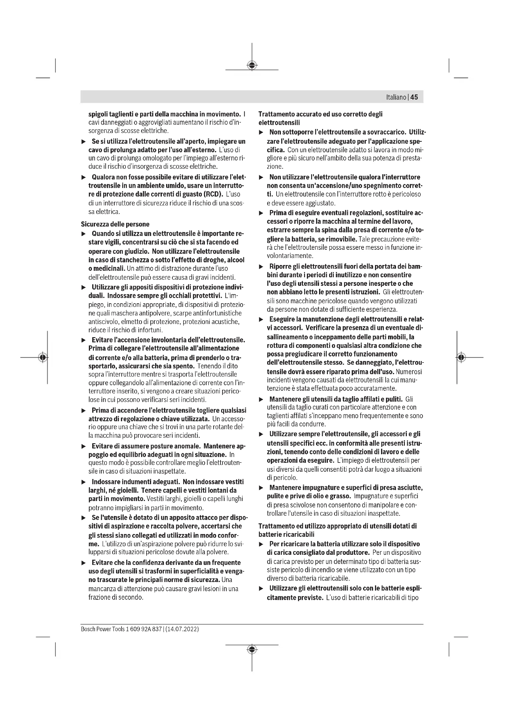 Low Energy Module GCY 30-4 (acessório) colocado dispõe de uma interface de comunicações. Devem ser respeitadas as limitações de utilização locais, p. ex. em aviões ou hospitais. u Só coloque a ferramenta elétrica no parafuso quando esta está desligada. As ferramentas de trabalho em rotação podem escorregar. Para retirar a ponta de aparafusar ou porta-bits universal, não pode ser usada uma ferramenta auxiliar. Suporte de fixação ao cinto Com o suporte de fixação ao cinto (10) pode pendurar a ferramenta elétrica, p. ex., num cinto. Desta forma terá ambas as mãos livres e a ferramenta elétrica estará sempre ao alcance. Manutenção e assistência técnica Manutenção e limpeza u A bateria deverá ser retirada antes de todos os trabalhos na ferramenta elétrica (p. ex. manutenção, troca de ferramenta etc.) e antes de transportar ou de armazenar a mesma. Há perigo de ferimentos se o interruptor de ligar/desligar for acionado involuntariamente. u Manter a ferramenta elétrica e as aberturas de ventilação sempre limpas, para trabalhar bem e de forma segura. Serviço pós-venda e aconselhamento O serviço pós-venda responde às suas perguntas a respeito de serviços de reparação e de manutenção do seu produto, assim como das peças sobressalentes. Desenhos explodidos Bosch Power Tools 1 609 92A 837 | (14.07.2022)44 | Italiano e informações acerca das peças sobressalentes também em: www.bosch-pt.com A nossa equipa de consultores Bosch esclarece com prazer todas as suas dúvidas a respeito dos nossos produtos e acessórios. Indique para todas as questões e encomendas de peças sobressalentes a referência de 10 dígitos de acordo com a placa de caraterísticas do produto. Portugal Robert Bosch LDA Avenida Infante D. Henrique Lotes 2E – 3E 1800 Lisboa Para efetuar o seu pedido online de peças entre na página www.ferramentasbosch.com. Tel.: 21 8500000 Fax: 21 8511096 Encontra outros endereços da assistência técnica em: www.bosch-pt.com/serviceaddresses Transporte As baterias de iões de lítio recomendadas estão sujeitas ao direito de materiais perigosos. As baterias podem ser transportadas na rua pelo utilizador, sem mais obrigações. Na expedição por terceiros (porex: transporte aéreo ou expedição), devem ser observadas as especiais exigências quanto à embalagem e à designação. Neste caso é necessário consultar um especialista de materiais perigosos ao preparar a peça a ser trabalhada. Só enviar baterias se a carcaça não estiver danificada. Colar contactos abertos e embalar a bateria de modo que não possa se movimentar dentro da embalagem. Por favor observe também eventuais diretivas nacionais suplementares. Eliminação As ferramentas elétricas, as baterias, os acessórios e as embalagens devem ser enviados a uma reciclagem ecológica de matéria prima. Não deitar ferramentas elétricas e baterias/ pilhas no lixo doméstico! Apenas para países da UE: Conforme a Diretiva Europeia 2012/19/UE relativa aos resíduos de equipamentos elétricos e eletrónicos e a sua implementação na legislação nacional, é necessário recolher separadamente as ferramentas elétricas que já não são usadas e, de acordo com a Diretiva Europeia 2006/66/CE, as baterias/pilhas defeituosas e encaminhá-las para uma reciclagem ecológica. No caso de uma eliminação incorreta, os aparelhos elétricos e eletrónicos antigos podem ter efeitos nocivos no ambiente e na saúda humada devido à possível presença de substâncias perigosas. Baterias/pilhas: Lítio: Observar as indicações no capítulo Transporte (ver "Transporte", Página44). Italiano Avvertenze di sicurezza Avvertenze generali di sicurezza per elettroutensili ATTENZIONE Leggere tutte le avvertenze di pe- ricolo, le istruzioni operative, le fi- gure e le specifiche fornite in dotazione al presente elet- troutensile. Il mancato rispetto di tutte le istruzioni sottoe- lencate potrà comportare il pericolo di scosse elettriche, in- cendi e/o gravi lesioni. Conservare tutte le avvertenze di pericolo e le istruzioni operative per ogni esigenza futura. Il termine "elettroutensile" riportato nelle avvertenze fa rife- rimento ai dispositivi dotati di alimentazione elettrica (a filo) o a batteria (senza filo). Sicurezza della postazione di lavoro u Conservare l'area di lavoro pulita e ben illuminata. Zo- ne disordinate o buie possono essere causa di incidenti. u Evitare di impiegare l’elettroutensile in ambienti sog- getti al rischio di esplosioni nei quali siano presenti li- quidi, gas o polveri infiammabili. Gli elettroutensili pro- ducono scintille che possono far infiammare la polvere o i gas. u Tenere lontani i bambini ed altre persone durante l’im- piego dell’elettroutensile. Eventuali distrazioni potran- no comportare la perdita del controllo sull’elettroutensile. Sicurezza elettrica u La spina di allacciamento alla rete dell’elettroutensile deve essere adatta alla presa. Evitare assolutamente di apportare qualsivoglia modifica alla spina. Non uti- lizzare spine adattatrici con elettroutensili dotati di collegamento a terra. Le spine non modificate e le prese adatte allo scopo riducono il rischio di scosse elettriche. u Evitare il contatto fisico con superfici collegate a ter- ra, come tubi, radiatori, fornelli elettrici e frigoriferi. Sussiste un maggior rischio di scosse elettriche nel mo- mento in cui il corpo è messo a massa. u Custodire l’elettroutensile al riparo dalla pioggia o dall’umidità.. La penetrazione dell’acqua in un elettrou- tensile aumenta il rischio di una scossa elettrica. u Non usare il cavo per scopi diversi da quelli previsti. Non usare il cavo per trasportare o appendere l’elet- troutensile, né per estrarre la spina dalla presa di cor- rente. Non avvicinare il cavo a fonti di calore, olio, 1 609 92A 837 | (14.07.2022) Bosch Power ToolsItaliano | 45 spigoli taglienti e parti della macchina in movimento. I cavi danneggiati o aggrovigliati aumentano