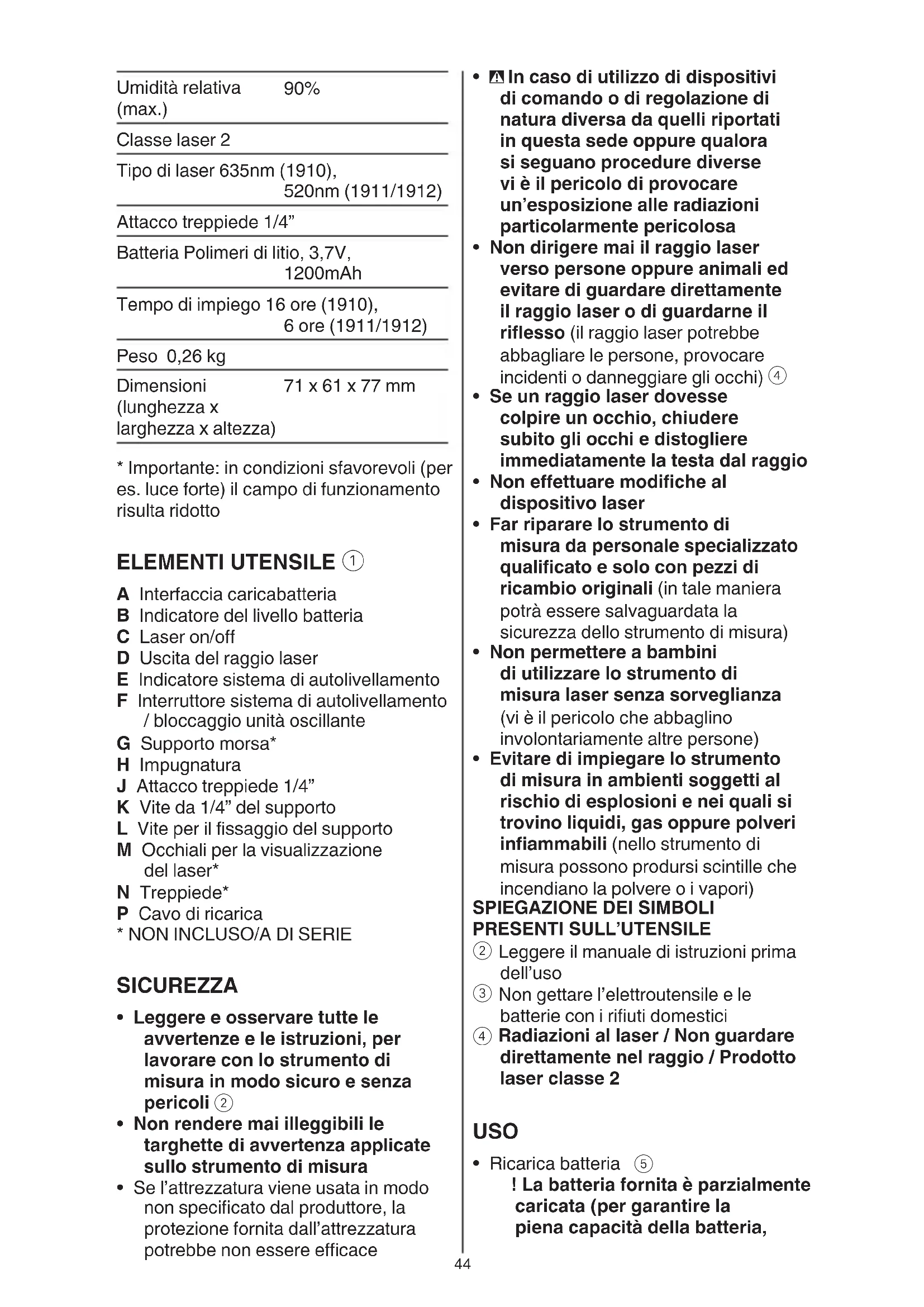 A Interfaccia caricabatteria B Indicatore del livello batteria C Laser on/o D Uscita del raggio laser E Indicatore sistema di autolivellamento F Interruttore sistema di autolivellamento / bloccaggio unità oscillante G Supporto morsa* H Impugnatura J Attacco treppiede 1/4” K Vite da 1/4” del supporto L Vite per il ssaggio del supporto M Occhiali per la visualizzazione del laser* N Treppiede* P Cavo di ricarica