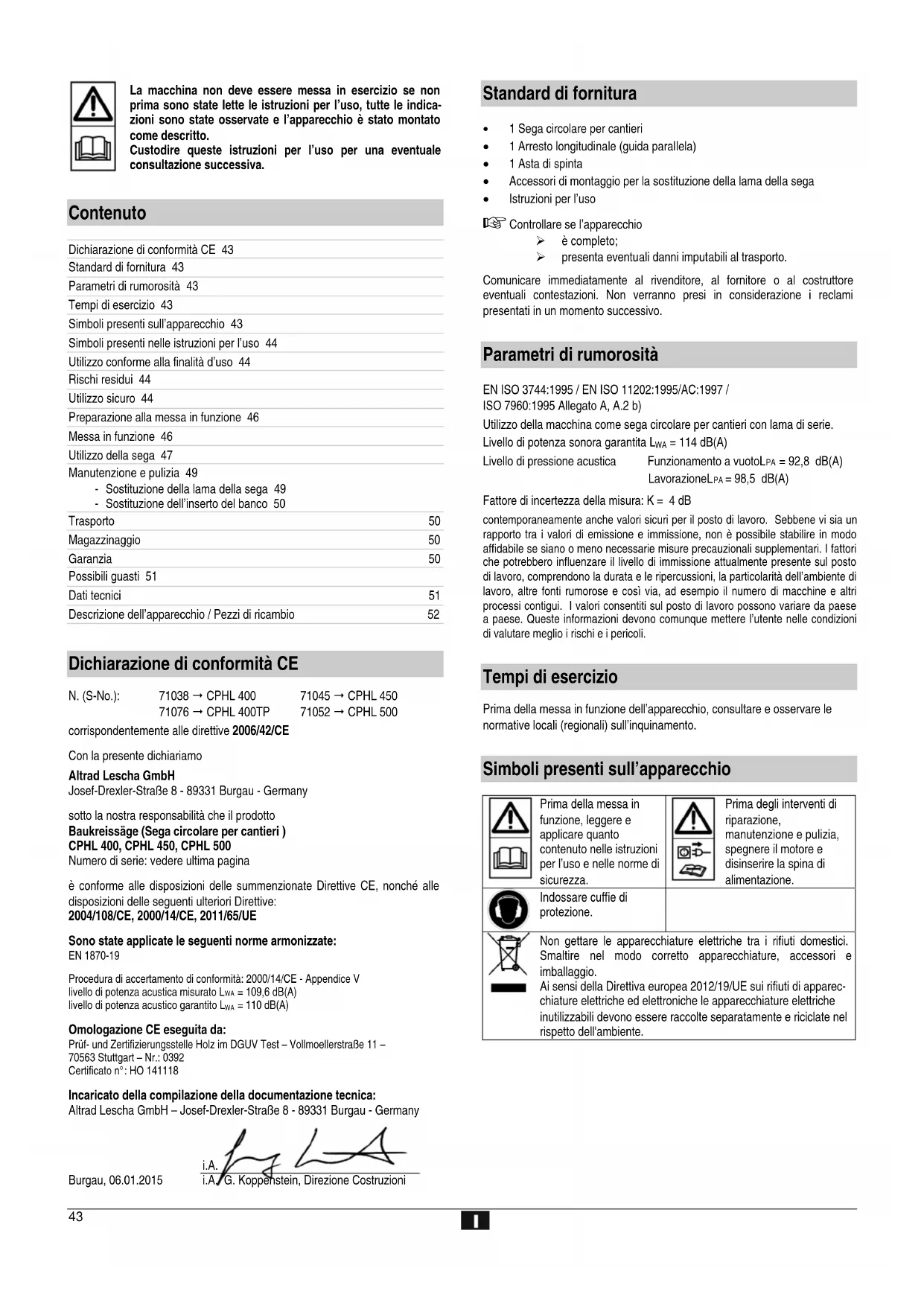 Numero di serie: vedere ultima pagina è conforme alle disposizioni delle summenzionate Direttive CE, nonché alle disposizioni delle seguenti ulteriori Direttive: 2004/108/CE, 2000/14/CE, 2011/65/UE Sono state applicate le seguenti norme armonizzate: EN 1870-19 Procedura di accertamento di conformità: 2000/14/CE - Appendice V livello di potenza acustica misurato L = 109,6 dB(A) livello di potenza acustico garantito L = 110 dB(A) Omologazione CE eseguita da: Prüf- und Zertifizierungsstelle Holz im DGUV Test – Vollmoellerstraße 11 – 70563 Stuttgart – Nr.: 0392 Certificato n°: HO 141118 Incaricato della compilazione della documentazione tecnica: Altrad Lescha GmbH – Josef-Drexler-Straße 8 - 89331 Burgau - Germany