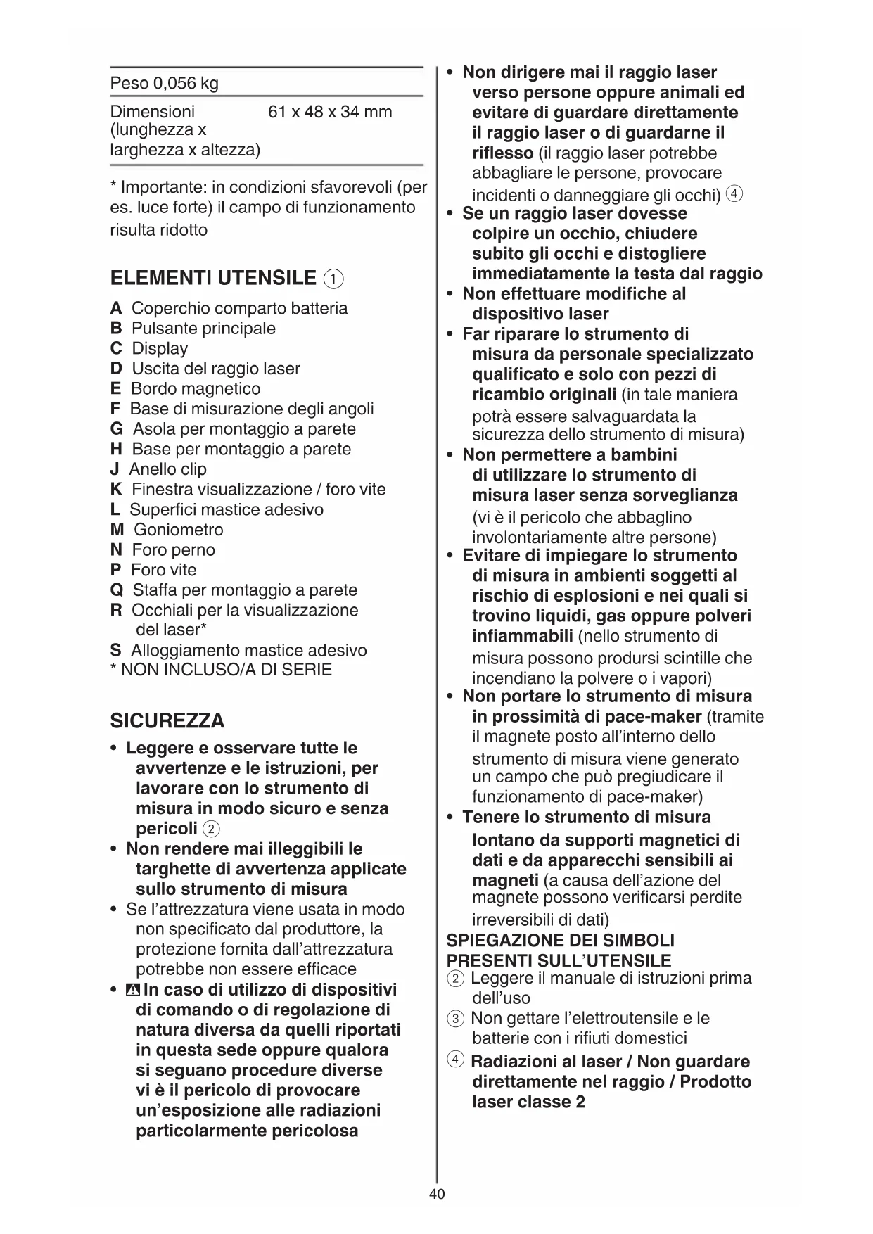 A Coperchio comparto batteria B Pulsante principale C Display D Uscita del raggio laser E Bordo magnetico F Base di misurazione degli angoli G Asola per montaggio a parete H Base per montaggio a parete J Anello clip K Finestra visualizzazione / foro vite L Superci mastice adesivo M Goniometro N Foro perno P Foro vite Q Staa per montaggio a parete R Occhiali per la visualizzazione del laser* S Alloggiamento mastice adesivo