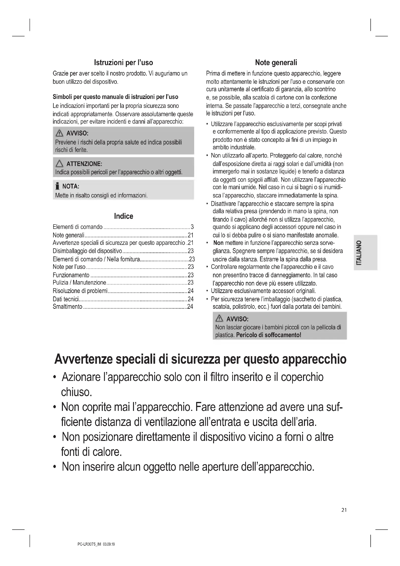 boli e devono essere allineati uno sull’altro. Risoluzione di problemi Problema Causa Soluzione L’apparecchio non funziona. Alimentazione elettrica assente. Esaminare la connessione dell’alimenta- zione. Difetto elettro- nico. Contattare il rivenditore o il dipartimento di assistenza. L’apparecchio fa troppo rumore. Elevata umidità dell’aria. Ridurre l’umidità dell’aria con un deumidificatore. Filtro sporco. Sostituire il filtro. Troppa poca aria fuoriesce dalla presa di uscita. Filtro sporco. Sostituire il filtro. Dati tecnici Modello: ............................................................... PC-LR 3075 Alimentazione rete: .................................. 220 - 240 V~, 50 Hz Consumo di energia: ....................................................... 25 W Prestazione in standby:..................................................0,3 W Classe di protezione: ........................................................... Peso netto: ...............................................................ca. 1,5 kg Si riserva il diritto di apportare modifiche tecniche e di design nel corso dello sviluppo del prodotto. Questo dispositivo risponde a tutte le direttive della CE, come la direttiva sulla compatibilità elettromagnetica e quella sul basso voltaggio ed è prodotto secondo le più recenti norme di sicurezza. Smaltimento Significato del simbolo “Eliminazione” Salvaguardare l’ambiente, gli elettrodomestici non vanno eliminati come rifiuti domestici. Per l’eliminazione degli elettrodomestici, fare uso dei posti di raccolta previsti per questo tipo e porre quegli elettrodomestici che non sono più in uso. Si contribuisce così ad evitare un effetto potenziale sull’am- biente e sulla salute, dovuto magari ad una eliminazione sbagliata. Questo significa un contributo personale alla riutilizzazione, al riciclaggio e altre forme di utilizzazione di elettrodomestici ed apparecchi elettronici usati. Si possono trovare le corrispondenti informazioni sugli ap- positi luoghi di raccolta, nelle amministrazioni dei comuni.PC-LR3075_IM 03.09.19