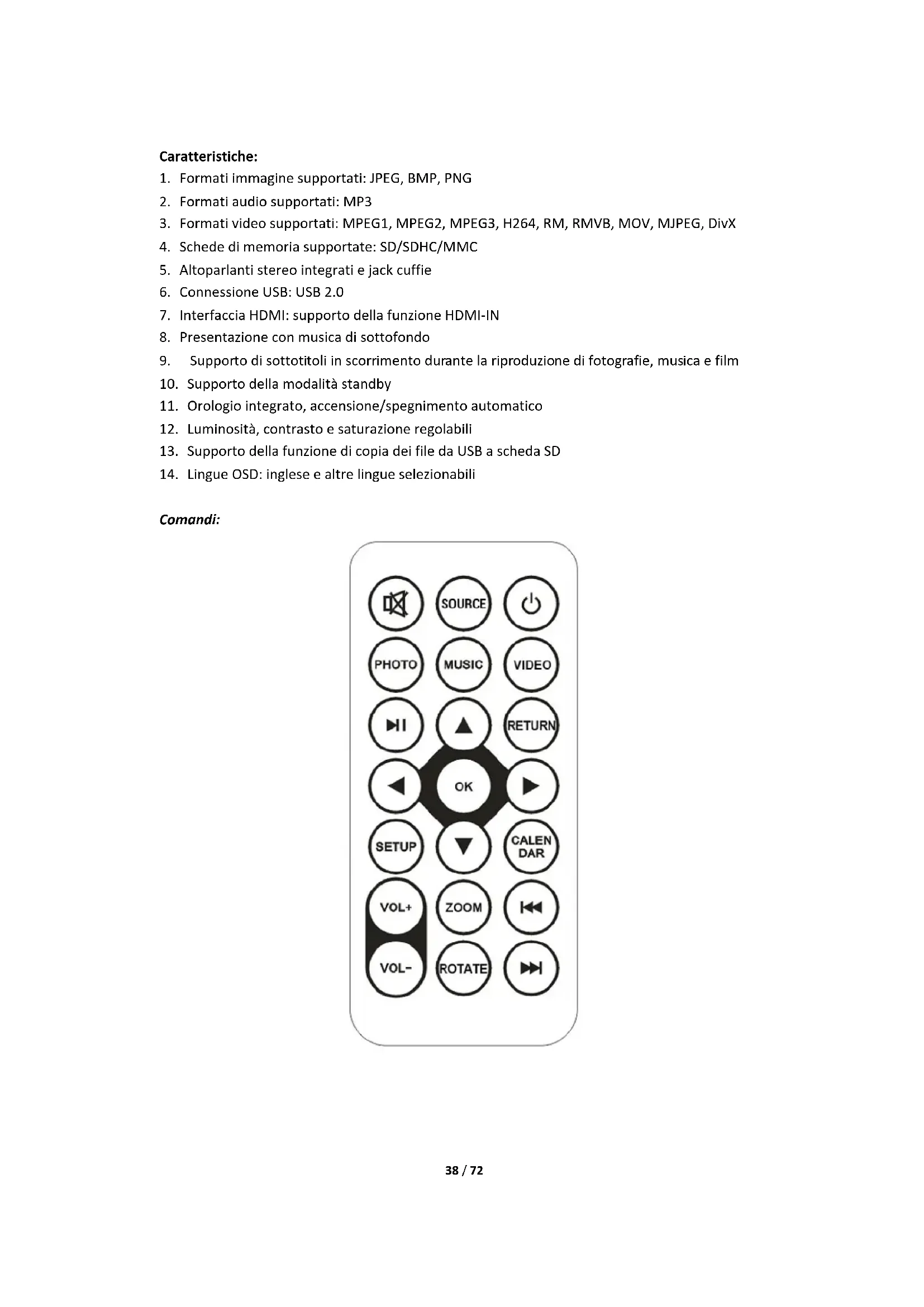 Comandi:39 / 72 ALIMENTAZIONE Accensione/spegnimento. SILENZIAMENTO Silenziamento SOURCE Ingresso segnale HDMI/AV/DMP PHOTO Modalità riproduzione foto diretta MUSIC Modalità riproduzione musica diretta VIDEO Modalità riproduzione video diretta