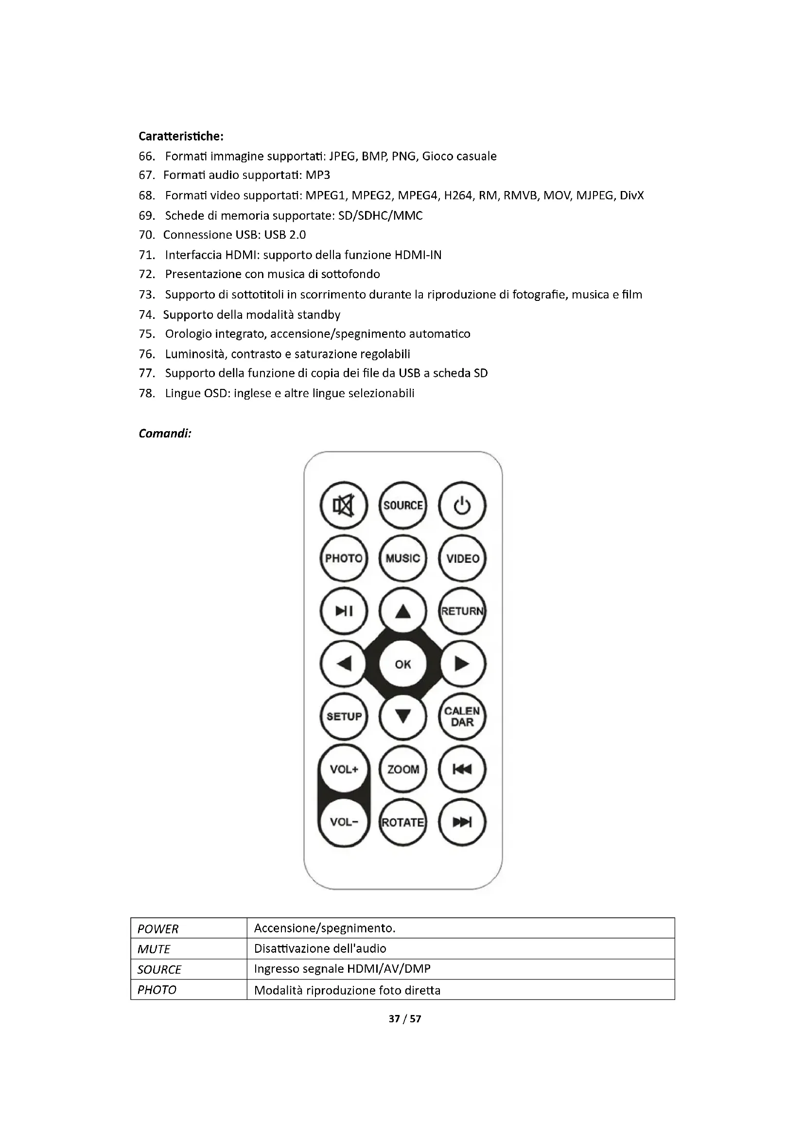 per accedere ai menu di foto, musica, video, calendario e impostazioni. Premere il pulsante