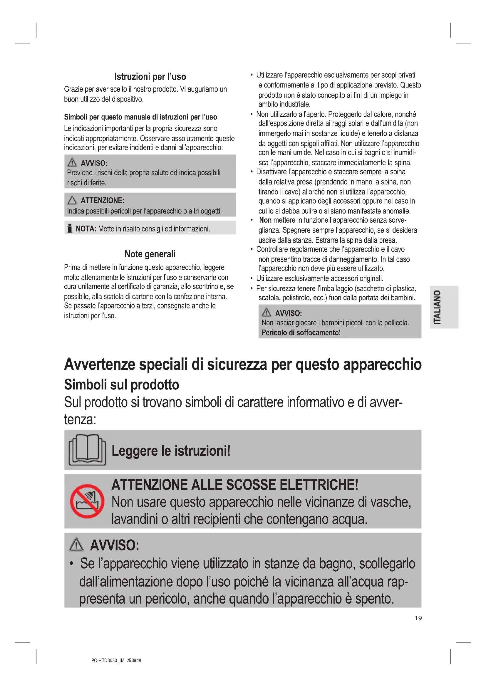 Prima diMETTEREinfunzionequestoappareccchio,leggere molto attentamenteleistruzioni perl'uso e conservarle con curaunitamentealcertificato digaranzia,allo scontrinoe,se possibile,alla scatola dicartone con la confezionione Interna. Se passate l'appareccchio a terzi,consegnateanche le istruzioni perl'uso.