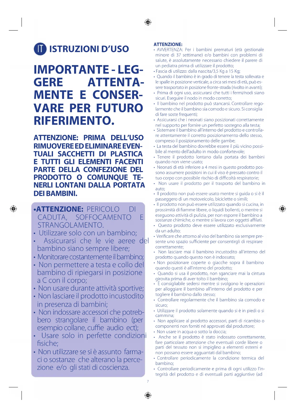 Attenzione: indossare sempre il prodotto prima di alloggiare il bambino dello stesso.