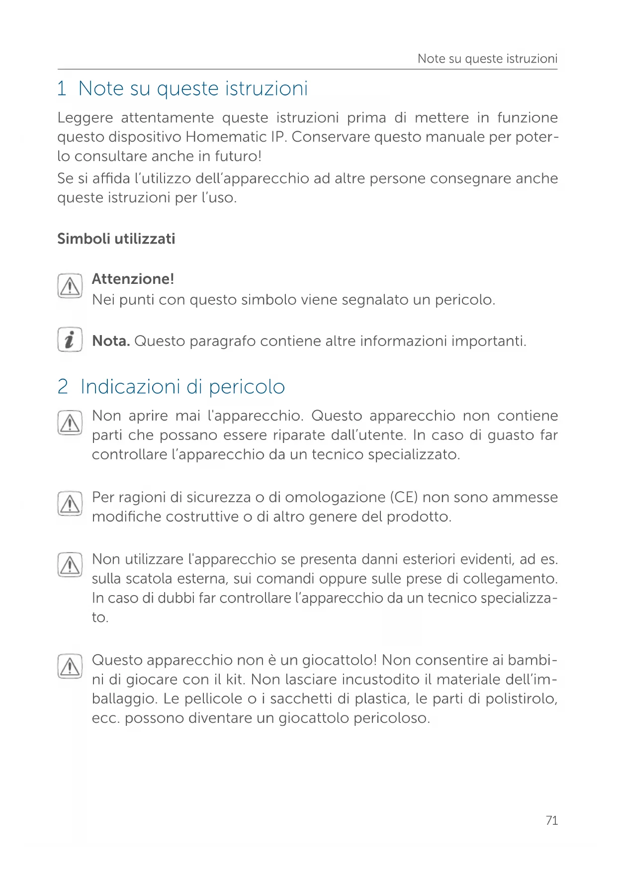 - 11 Dati tecnici Note su queste istruzioni 1 Note su queste istruzioni Leggere attentamente queste istruzioni prima di mettere in funzione questo dispositivo Homematic IP. Conservare questo manuale per poter- lo consultare anche in futuro! Se si ada l’utilizzo dell’apparecchio ad altre persone consegnare anche queste istruzioni per l’uso. Simboli utilizzati Attenzione! Nei punti con questo simbolo viene segnalato un pericolo. Nota. Questo paragrafo contiene altre informazioni importanti. 2 Indicazioni di pericolo Non aprire mai l'apparecchio. Questo apparecchio non contiene parti che possano essere riparate dall’utente. In caso di guasto far controllare l’apparecchio da un tecnico specializzato. Per ragioni di sicurezza o di omologazione (CE) non sono ammesse modifiche costruttive o di altro genere del prodotto. Non utilizzare l'apparecchio se presenta danni esteriori evidenti, ad es. sulla scatola esterna, sui comandi oppure sulle prese di collegamento. In caso di dubbi far controllare l’apparecchio da un tecnico specializza p. 8471