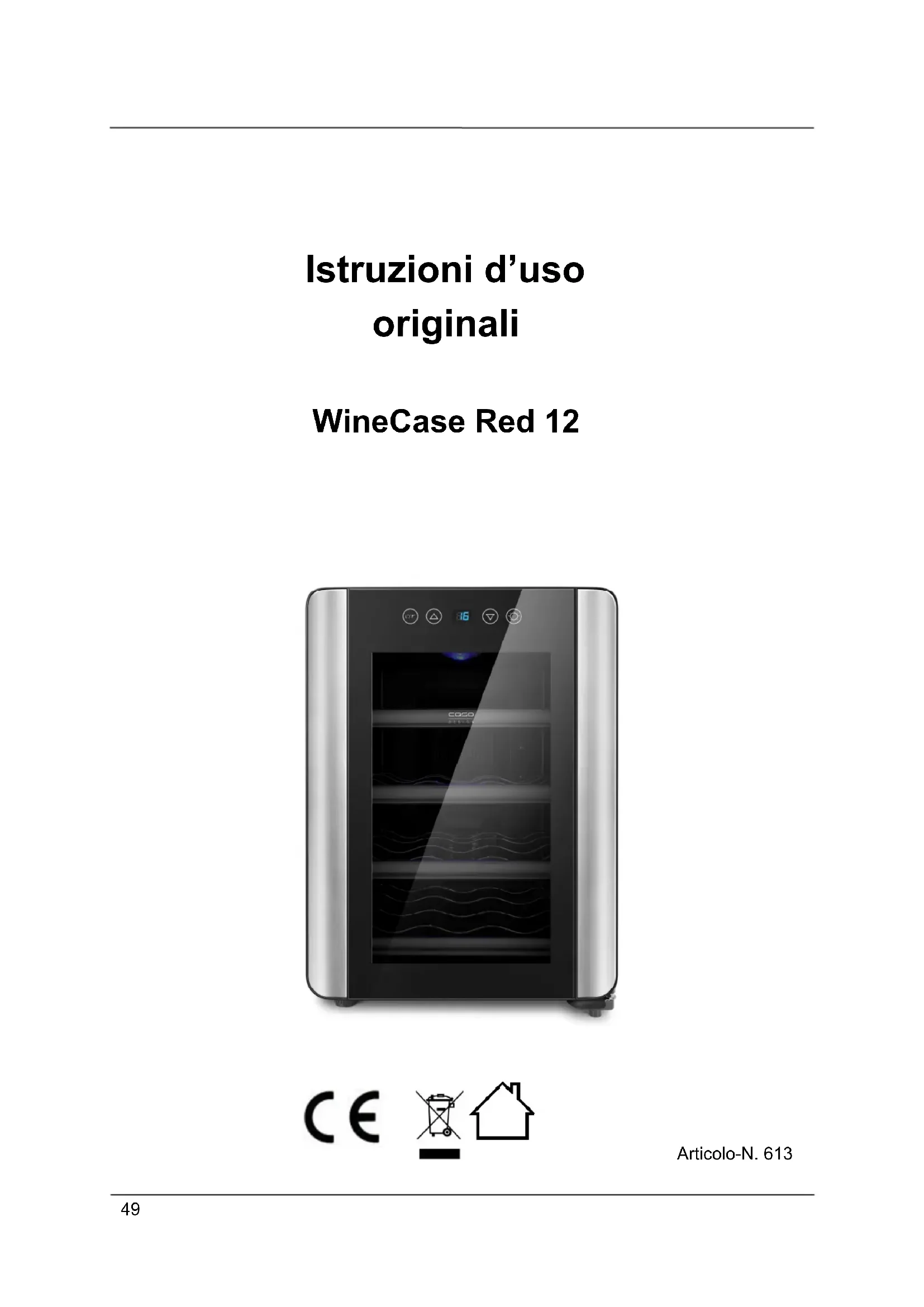 Queste istruzioni d’uso sono una componente del WineCase Red 12 (di seguito chiamato l’apparecchio) e Le fornirà importanti indicazioni per la messa in funzione, la sicurezza, un utilizzo conforme alle disposizioni e per la cura dell’apparecchio. Le istruzioni d'uso devono trovarsi sempre nelle vicinanze dell’apparecchio. Dovranno essere lette ed utilizzate da qualsiasi persona, incaricata con la: messa in funzione, l’utilizzo, l'eliminazione di malfunzionamenti e/o la pulizia dell’apparecchio. Conservi queste istruzioni d'uso e le passi insieme all’apparecchio al successivo proprietario.