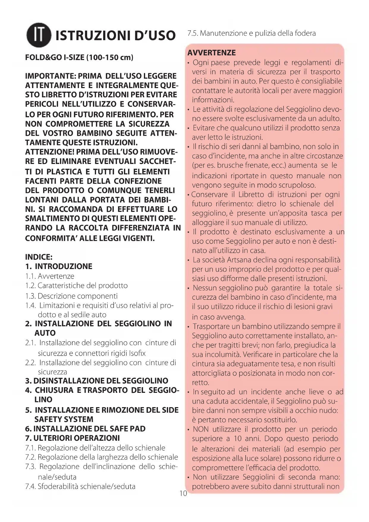 1.1. Avvertenze 1.2. Caratteristiche del prodotto 1.3. Descrizione componenti 1.4. Limitazioni e requisiti d’uso relativi al pro- dotto e al sedile auto