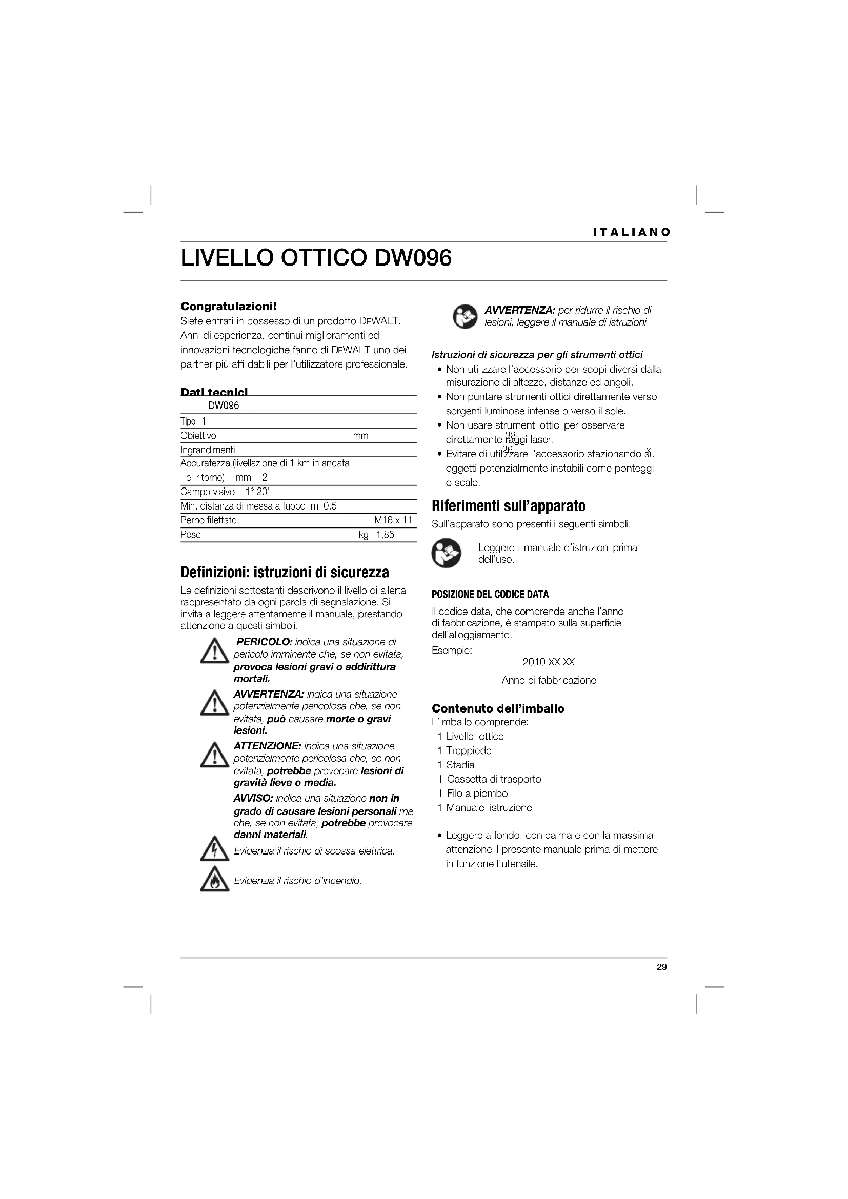 Congratulazioni! Siete entrati in possesso di un prodotto DEWALT. Anni di esperienza, continui miglioramenti ed innovazioni tecnologiche fanno di D EWALT uno dei partner più affi dabili per l’utilizzatore professionale. Dati tecnici DW096 Tipo 1 Obiettivo mm 38 Ingrandimenti 26 x Accuratezza (livellazione di 1 km in andata e ritorno) mm 2 Campo visivo 1° 20' Min. distanza di messa a fuoco m 0,5 Perno fi lettato M16 x 11 Peso kg 1,85 Defi nizioni: istruzioni di sicurezza Le definizioni sottostanti descrivono il livello di allerta rappresentato da ogni parola di segnalazione. Si invita a leggere attentamente il manuale, prestando attenzione a questi simboli. PERICOLO: indica una situazione di pericolo imminente che, se non evitata, provoca lesioni gravi o addirittura mortali. AVVERTENZA: indica una situazione potenzialmente pericolosa che, se non evitata, può causare morte o gravi lesioni. ATTENZIONE: indica una situazione potenzialmente pericolosa che, se non evitata, potrebbe provocare lesioni di gravità lieve o media. AVVISO: indica una situazione non in grado di causare lesioni personali ma che, se non evitata, potrebbe provocare danni materiali. Evidenzia il rischio di scossa elettrica. Evidenzia il rischio d’incendio. AVVERTENZA: per ridurre il rischio di lesioni, leggere il manuale di istruzioni Istruzioni di sicurezza per gli strumenti ottici