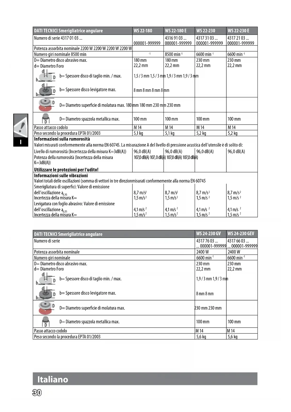 D= Diametro disco abrasivo max. d= Diametro Foro 180 mm 22,2 mm 180 mm 22,2 mm 230 mm 22,2 mm 230 mm 22,2 mm b= Spessore disco di taglio min. / max. 1,5 / 3 mm 1,5 / 3 mm 1,9 / 3 mm 1,9 / 3 mm b= Spessore disco levigatore max. 8 mm 8 mm 8 mm 8 mm D= Diametro supercie di molatura max. 180 mm 180 mm 230 mm 230 mm D= Diametro spazzola metallica max. 100 mm 100 mm 100 mm 100 mm Passo attacco codolo M 14 M 14 M 14 M 14 Peso secondo la procedura EPTA 01/2003 5,1 kg 5,1 kg 5,2 kg 5,2 kg Informazioni sulla rumorosità Valori misurati conformemente alla norma EN 60745. La misurazione A del livello di pressione acustica dell’utensile è di solito di: Livello di rumorosità (Incertezza della misura K=3dB(A)) 96,0 dB(A) 96,0 dB(A) 96,0 dB(A) 96,0 dB(A) Potenza della rumorosità (Incertezza della misura K=3dB(A)) Utilizzare le protezioni per l‘udito! 107,0 dB(A) 107,0 dB(A) 107,0 dB(A) 107,0 dB(A) Informazioni sulle vibrazioni Valori totali delle oscillazioni (somma di vettori in tre direzionmisurati conformemente alla norma EN 60745 Smerigliatura di superci: Valore di emissione dell’oscillazione a h,SG Incertezza della misura K= 8,7 m/s