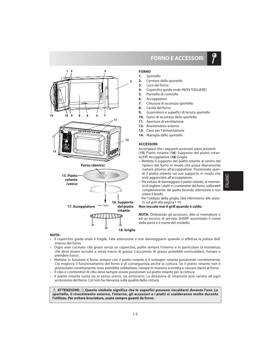 ATTENZIONE: Questo significo significica che le superfici possono riscaldarsi durante l'uso. Lo sportello, il rivestimento esterno, l'interno, gli accessori e i piatti si calderanno molto durante l'utilizzo. Per evitare bruciature, usate sempre quanti da forno.