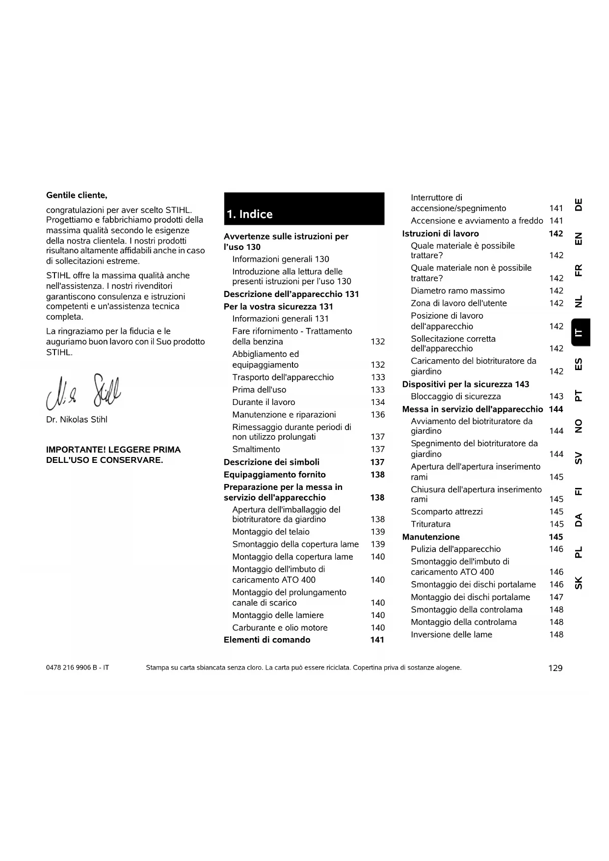 DEENFRNLESPTNOSVFIDAPLSK IT 0478 216 9906 B - IT Gentile cliente, congratulazioni per aver scelto STIHL. Progettiamo e fabbrichiamo prodotti della massima qualità secondo le esigenze della nostra clientela. I nostri prodotti risultano altamente affidabili anche in caso di sollecitazioni estreme. STIHL offre la massima qualità anche nell'assistenza. I nostri rivenditori garantiscono consulenza e istruzioni competenti e un'assistenza tecnica completa. La ringraziamo per la fiducia e le auguriamo buon lavoro con il Suo prodotto STIHL. Dr. Nikolas Stihl