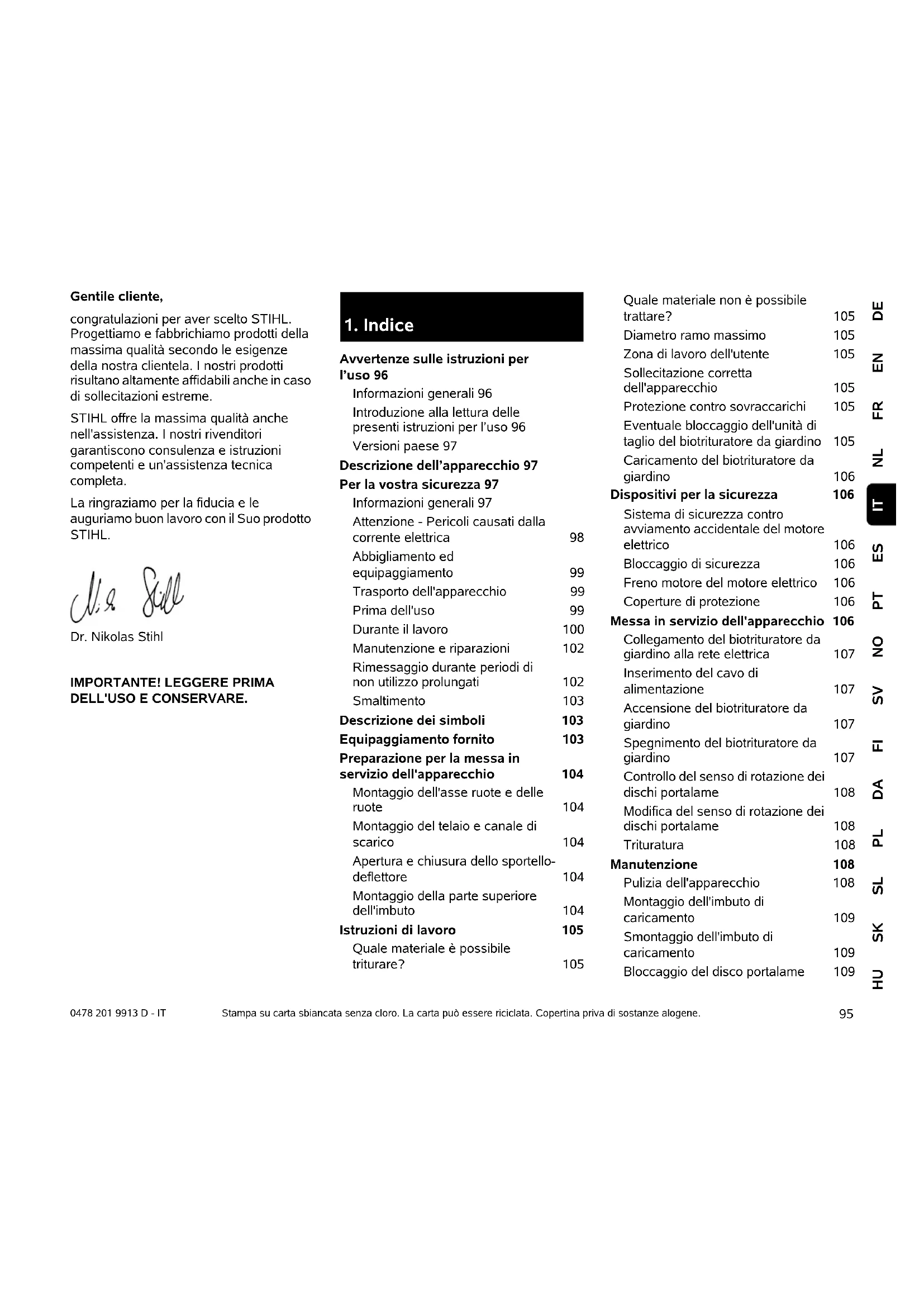 DEENFRNLESPTNOSVFIDAPLSLSKHU IT 0478 201 9913 D - IT Gentile cliente, congratulazioni per aver scelto STIHL. Progettiamo e fabbrichiamo prodotti della massima qualità secondo le esigenze della nostra clientela. I nostri prodotti risultano altamente affidabili anche in caso di sollecitazioni estreme. STIHL offre la massima qualità anche nell'assistenza. I nostri rivenditori garantiscono consulenza e istruzioni competenti e un'assistenza tecnica completa. La ringraziamo per la fiducia e le auguriamo buon lavoro con il Suo prodotto STIHL. Dr. Nikolas Stihl