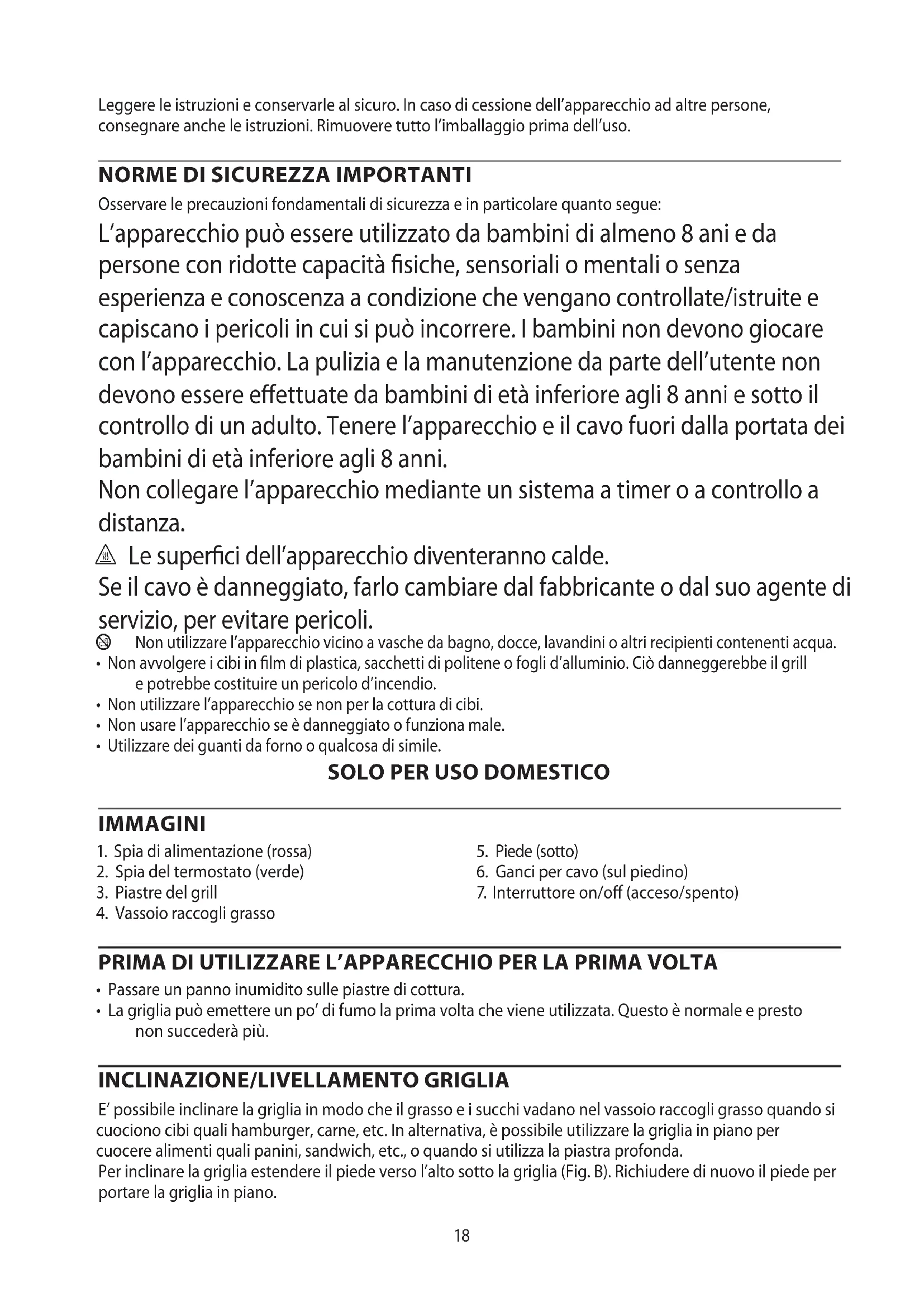 E’ possibile inclinare la griglia in modo che il grasso e i succhi vadano nel vassoio raccogli grasso quando si cuociono cibi quali hamburger, carne, etc. In alternativa, è possibile utilizzare la griglia in piano per cuocere alimenti quali panini, sandwich, etc., o quando si utilizza la piastra profonda. Per inclinare la griglia estendere il piede verso l’alto sotto la griglia (Fig. B). Richiudere di nuovo il piede per portare la griglia in piano.19