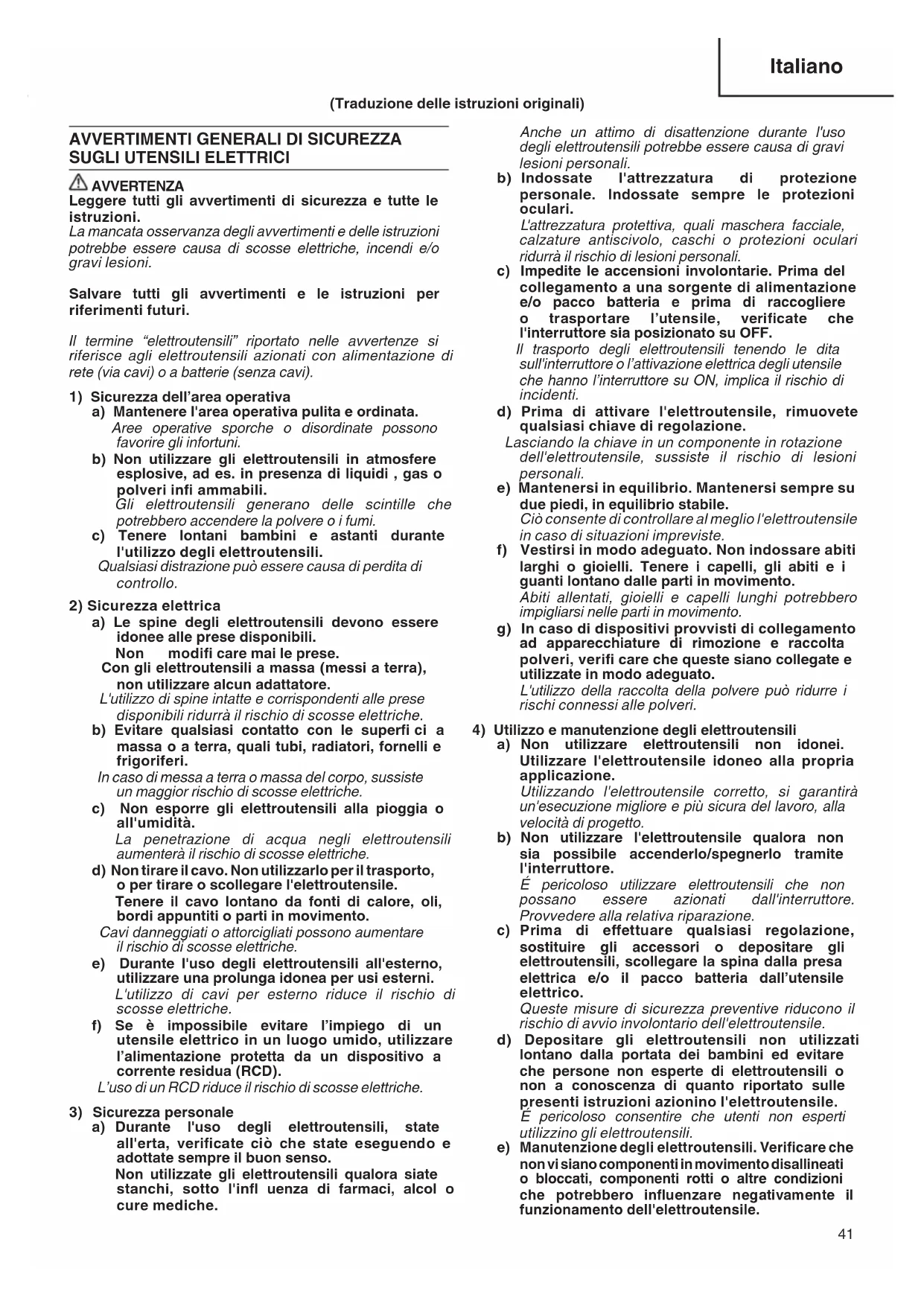 AVVERTENZA Leggere tutti gli avvertimenti di sicurezza e tutte le istruzioni. La mancata osservanza degli avvertimenti e delle istruzioni potrebbe essere causa di scosse elettriche, incendi e/o gravi lesioni. Salvare tutti gli avvertimenti e le istruzioni per riferimenti futuri. Il termine “elettroutensili” riportato nelle avvertenze si riferisce agli elettroutensili azionati con alimentazione di rete (via cavi) o a batterie (senza cavi).