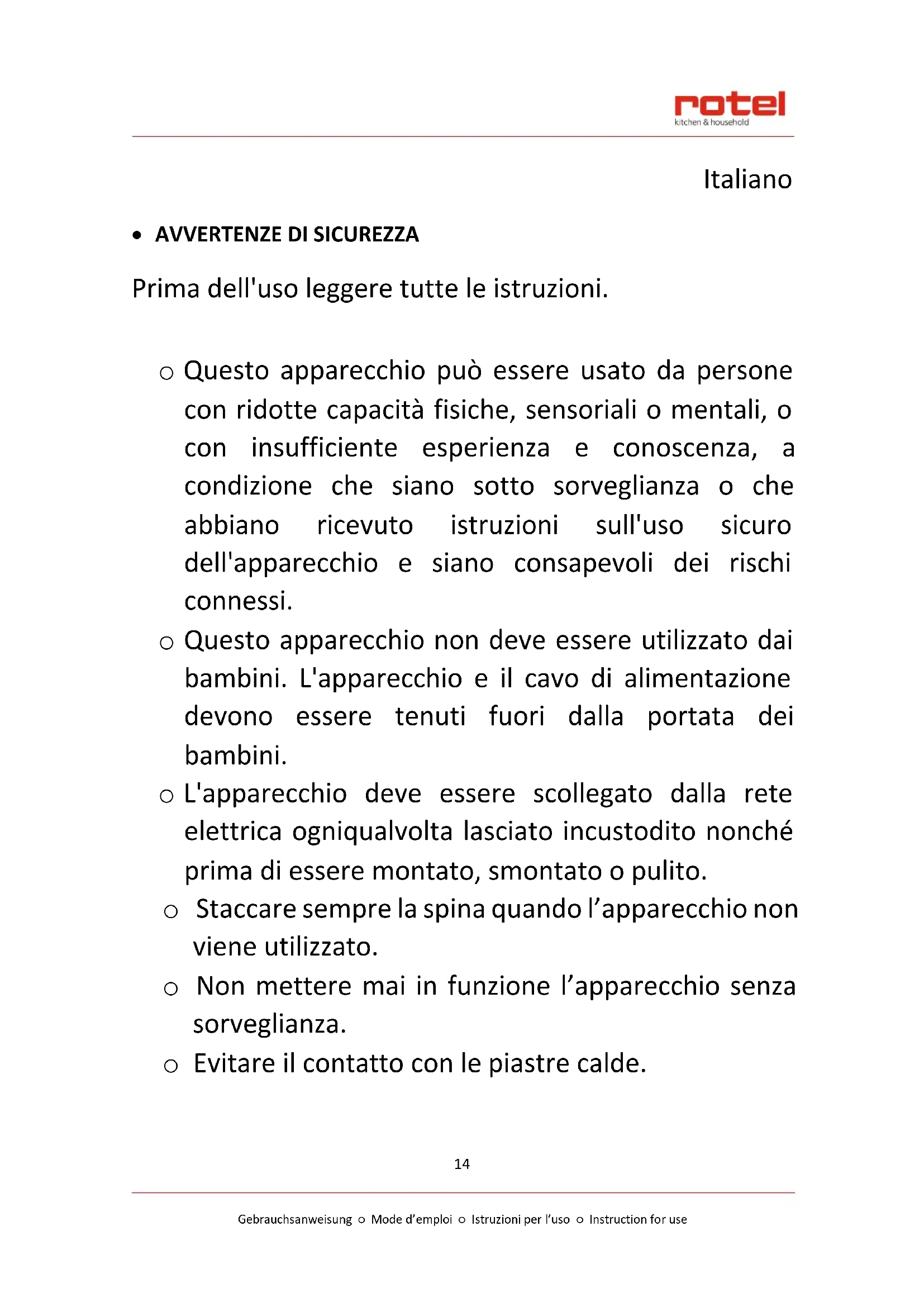 - AVVERTENZE DI SICUREZZA Prima dell'uso leggere tutte le istruzioni. o Questo apparecchio può essere usato da persone con ridotte capacità fisiche, sensoriali o mentali, o con insufficiente esperienza e conoscenza, a condizione che siano sotto sorveglianza o che abbiano ricevuto istruzioni sull'uso sicuro dell'apparecchio e siano consapevoli dei rischi connessi. o Questo apparecchio non deve essere utilizzato dai bambini. L'apparecchio e il cavo di alimentazione devono essere tenuti fuori dalla portata dei bambini. o L'apparecchio deve essere scollegato dalla rete elettrica ogniqualvolta lasciato incustodito nonché prima di essere montato, smontato o pulito. o Staccare sempre la spina quando l’apparecchio non viene utilizzato. o Non mettere mai in funzione l’apparecchio senza sorveglianza. o Evitare il contatto con le piastre calde.Gebrauchsanweisung ○ Mode d’emploi ○ Istruzioni per l’uso ○ Instruction for use