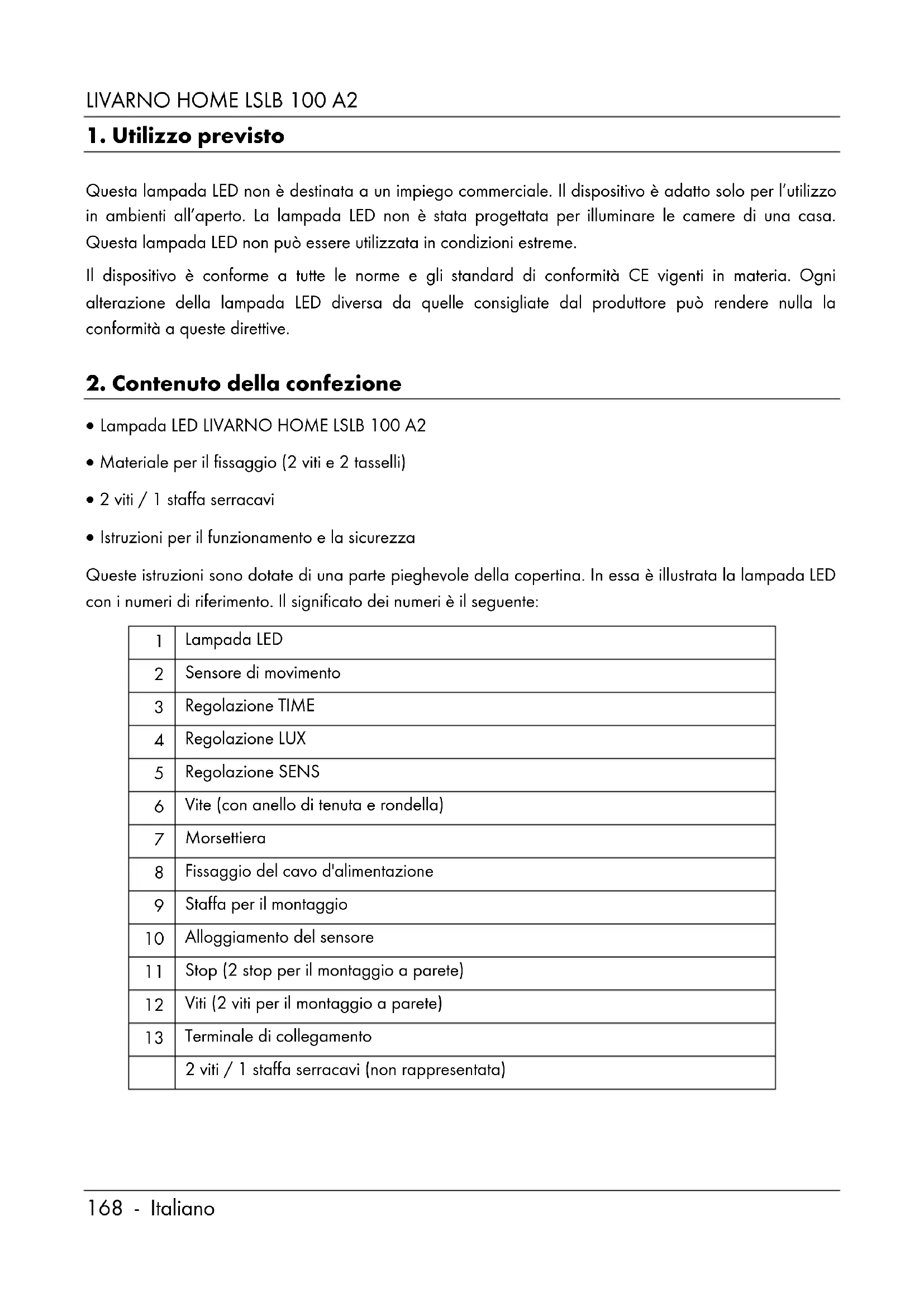 Quando si utilizza questa lampada LED (1) per la prima volta, leggere le seguenti istruzioni e rispettare tutti gli avvertimenti, anche se si ha dimestichezza con i dispositivi elettronici. Conservare queste istruzioni in un luogo sicuro per un eventuale utilizzo futuro. In caso di vendita o cessione del dispositivo, è importante che questo manuale vi sia allegato. Spiegazione dei simboli Nel caso in cui i coperchi di sicurezza dovessero rompersi, sarà necessario sostituirli. La lampada LED (1) è dotata di collegamento del conduttore di messa a terra. Il filo di messa a terra (giallo/verde) deve essere collegato al terminale di collegamento (13). PERICOLO! Questo segnale indica un pericolo ad alto rischio di morte o ferite gravi. ATTENZIONE! Questo segnale indica un pericolo a medio rischio di morte o ferite gravi. AVVERTENZA! Questo segnale indica importanti istruzioni per la protezione da danni alle cose. PERICOLO! Questo simbolo indica tensione elettrica nociva! Questo simbolo indica ulteriori informazioni sull’argomento. Non adatto per illuminare ambienti interni in casa.LIVARNO HOME LSLB 100 A2 Italiano - 171 La lampada LED non può essere attenuata. L'angolo del fascio di luce della lampada LED è circa 120°. Fino all'80% di risparmio energetico rispetto a un faro alogeno da 500 watt. Durata dell'illuminazione regolabile da circa 5 sec a 5 min. Il sensore di movimento può essere ruotato Flusso luminoso totale circa 10000 lm/100W Resistente all'acqua e a prova di schizzi (IP44) L'angolo di rilevamento del sensore di movimento è circa 8 m.