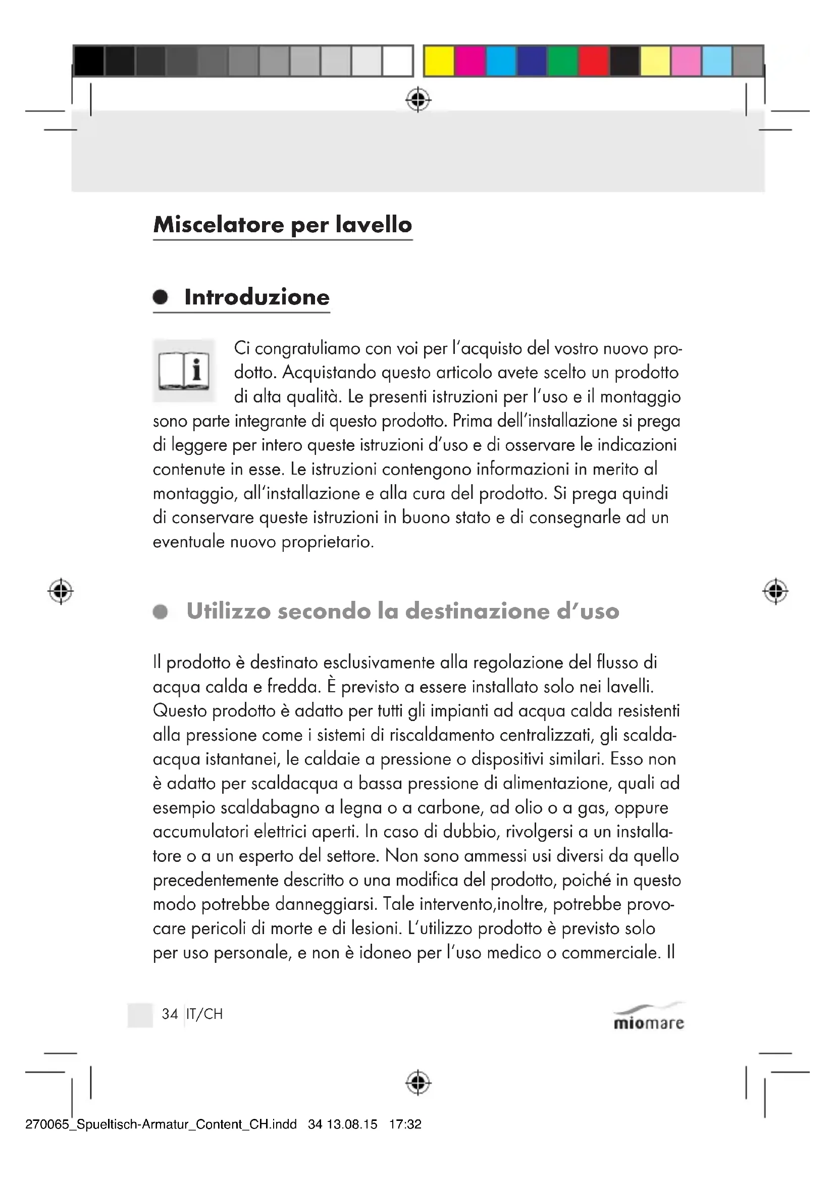 di uno smaltimento non dannoso per l’ambiente. Informazioni Potabilità dell‘acqua di rubinetto Informarsi presso le autorità competenti riguardo alla potabilità dell‘acqua nella propria città / comune. 270065_Spueltisch-Armatur_Content_CH.indd 42 13.08.15 17:3243 IT/CH In genere, con riferimento alla potabilità dell’acqua, si consiglia di mettere in pratica i seguenti suggerimenti: Far scorrere l‘acqua per un breve lasso di tempo in presenza di acqua ristagnata nelle tubature per più di quattro ore. Non utiliz- zare acqua di stagnazione per la preparazione di cibi e bevande, in modo particolare per la nutrizione di lattanti. In caso contrario, possono insorgere problemi di salute. È possibile riconoscere l’acq