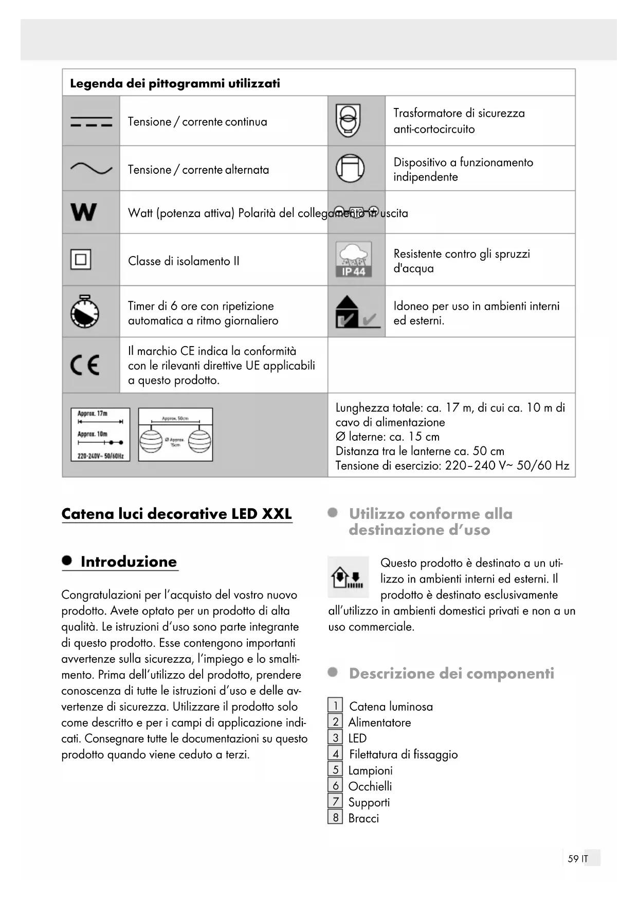 DAMENTO! Non mettere in funzione il prodotto quando si trova all’interno della confezione. Dopo l’uso, conservare il prodotto nella con- fezione per evitare danneggiamenti involontari. Non tirare il cavo del prodotto ed assicurarsi che sia posato in maniera tale che nessuno possa inciamparvi o camminarci sopra. Non fissare altri oggetti sul prodotto. La lampadina non è sostituibile. Se la lampadina giunge al termine del proprio ciclo di servizio, l’intero prodotto deve essere sostituito. Il prodotto non può essere utilizzato senza tutti gli anelli di guarnizione posizionati in modo corretto.61 IT Evitare situazioni rischiose che potrebbero causare morte per folgorazione! Prima dell’uso, assicurarsi che l’alimentazione elettrica presente sia adeguata alla tensione di esercizio del prodotto (220–240 V∼). Prima di ogni collegamento, assicurarsi che non siano presenti eventuali danni nella catena luminosa e nell’alimentatore. Non utilizzare mai il prodotto se si rilevano danneggiamenti. Il cavo esterno flessibile del prodotto non può essere sostituito; qualora il cavo fosse dan- neggiato, il prodotto dovrà essere smaltito. Non aprire mai nessuno dei componenti elettrici e non inserirvi alcun oggetto. Proteggere il cavo di alimentazione da spigoli pronunciati, da sollecitazioni meccaniche e da superfici calde. Non fissare con graffe o chiodi appuntiti. Staccare sempre l’alimentatore dalla presa elettrica prima del montaggio, dello smontag- gio o della pulizia. Non toccare con mani bagnate né la spina del prodotto né il prodotto stesso. Il prodotto non deve essere collegato elettri- camente con un’altra catena luminosa. In caso di inutilizzo prolungato, scollegare il prodotto dalla rete elettrica. Per domande o dubbi riguardo al prodotto, rivolgersi a un elettricista. Utilizzare il prodotto soltanto con l’alimenta- tore fornito della tipologia del modello n° S0135G045W2D, altrimenti ogni diritto di garanzia decade. Questa catena luminosa è protetta dagli spruzzi d’acqua (IP44). Questa categoria di isolamento può essere garantita solamente se la presa elettrica utilizzata corrisponde ad al- meno questa categoria di protezione. Il driver LED può essere sostituito esclusivamente da personale qualificato. Montaggio del lampione (vedi Fig. B) Posizionare i lampioni