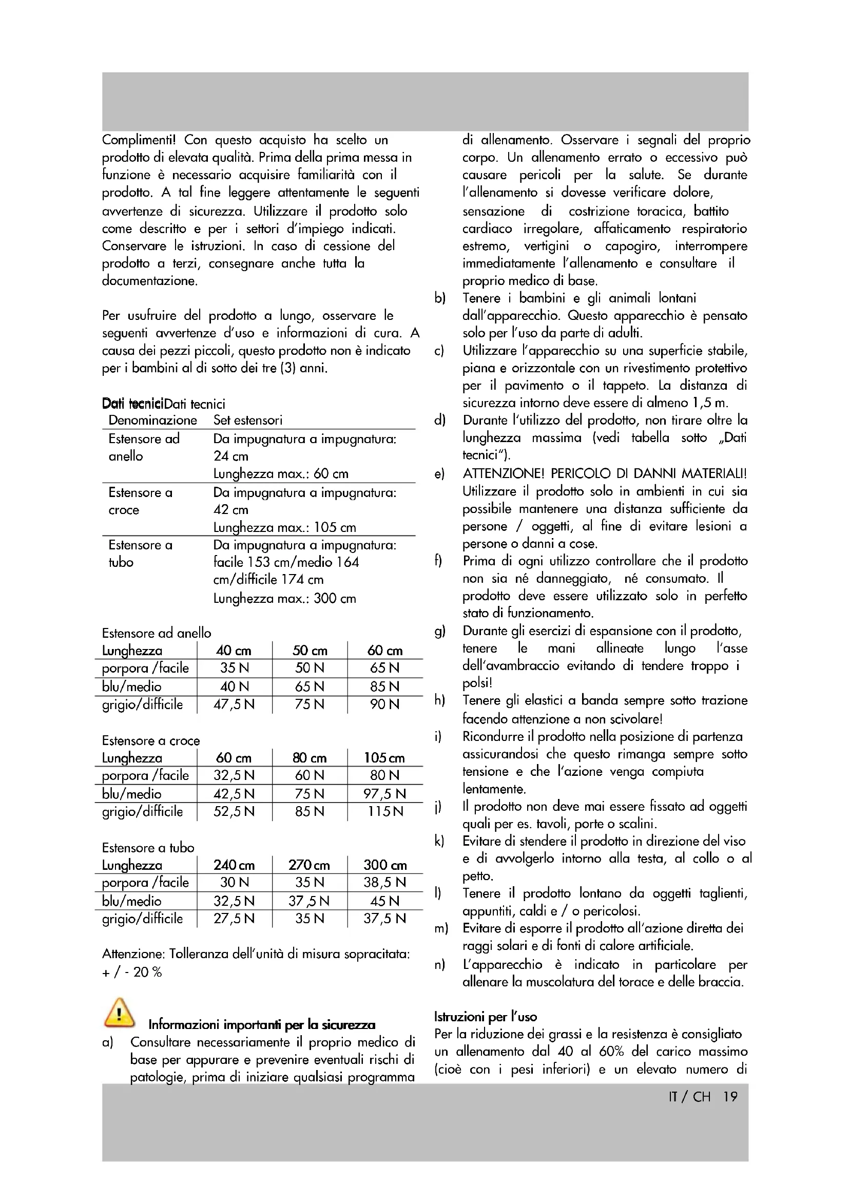 assicurandosi che questo rimanga sempre sotto tensione e che lÂazione venga compiuta lentamente. j) Il prodotto non deve mai essere fissato ad oggetti quali per es. tavoli, porte o scalini. k) Evitare di stendere il prodotto in direzione del viso e di avvolgerlo intorno alla testa, al collo o al petto. l) Tenere il prodotto lontano da oggetti taglienti, appuntiti, caldi e / o pericolosi. m) Evitare di esporre il prodotto allÂazione diretta dei raggi solari e di fonti di calore artificiale. n) L'apparecchio è indicato in particolare per allenare la muscolatura del torace e delle braccia. Istruzioni per l'uso Istruzioni per l'usoIstruzioni per l'uso Istruzioni per l'uso