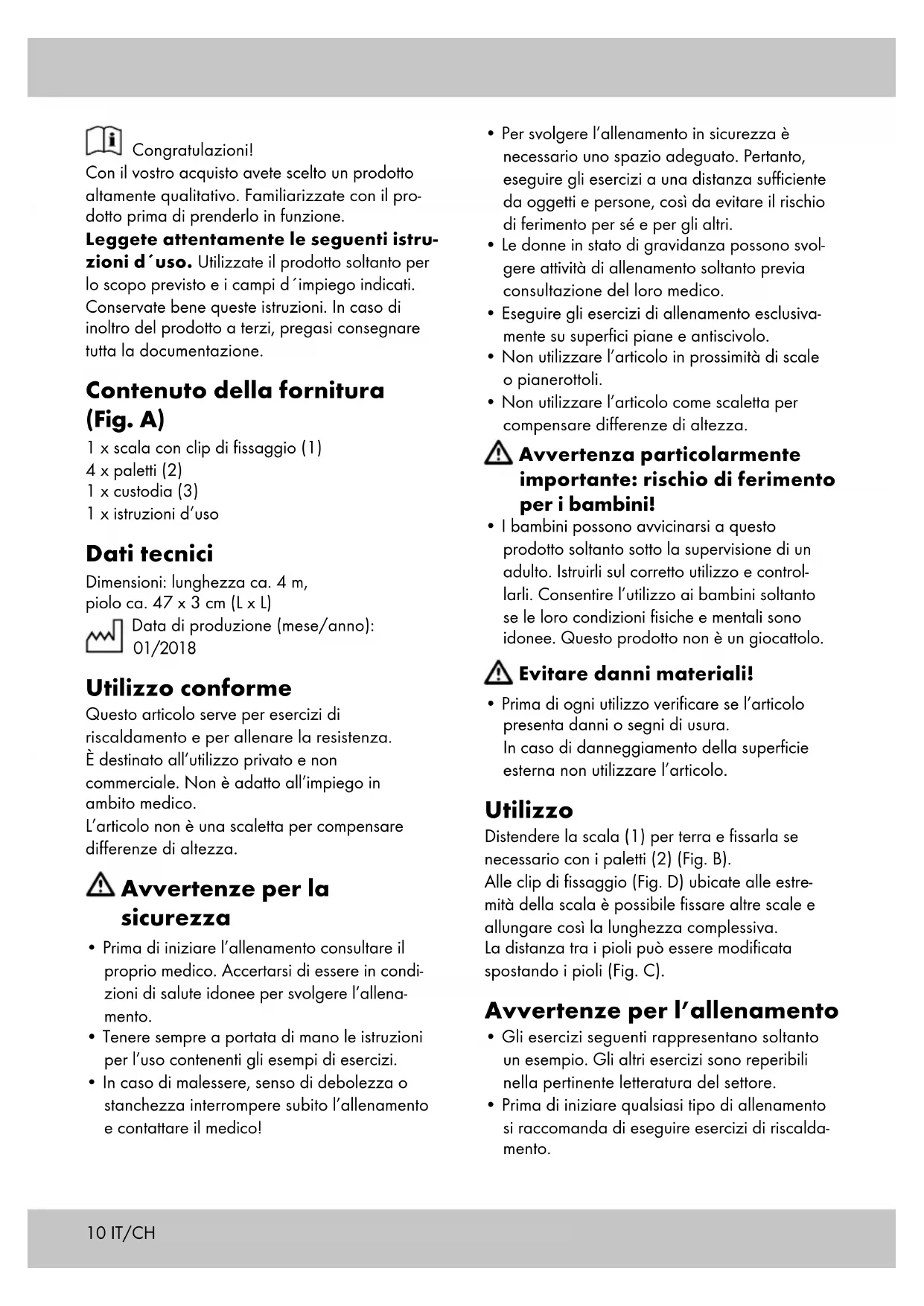 - Prima di iniziare qualsiasi tipo di allenamento si raccomanda di eseguire esercizi di riscalda- mento. Congratulazioni! Con il vostro acquisto avete scelto un prodotto altamente qualitativo. Familiarizzate con il pro- dotto prima di prenderlo in funzione. Leggete attentamente le seguenti istru- zioni d´uso. Utilizzate il prodotto soltanto per lo scopoprevisto e i campi d´impiego indicati. Conservate bene queste istruzioni. In caso di inoltro del prodotto a terzi, pregasi consegnare tutta la documentazione. Contenuto della fornitura (Fig. A) 1 x scala con clip di fissaggio (1) 4 x paletti (2) 1 x custodia (3) 1 x istruzioni d‘uso Dati tecnici Dimensioni: lunghezza ca. 4 m, piolo ca. 47 x 3 cm (L x L) Data di produzione (mese/anno): 01/2018 Utilizzo conforme Questo articolo serve per esercizi di riscaldamento e per allenare la resistenza. È destinato all’utilizzo privato e non commerciale. Non è adatto all’impiego in ambito medico. L’articolo non è una scaletta per compensare differenze di altezza. Avvertenze per la sicurezza