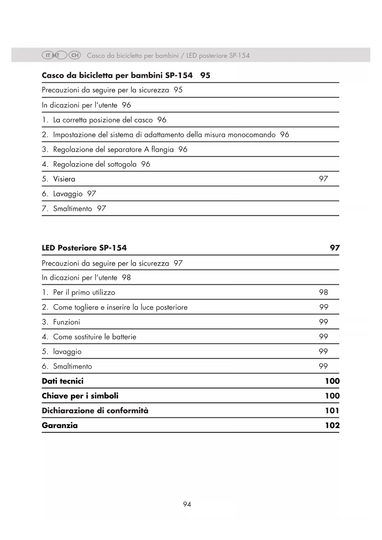 Casco da bicicletta per bambini / LED posteriore SP-154 Casco da bicicletta per bambini SP-154 95 Precauzioni da seguire per la sicurezza 95 In dicazioni per l‘utente 96