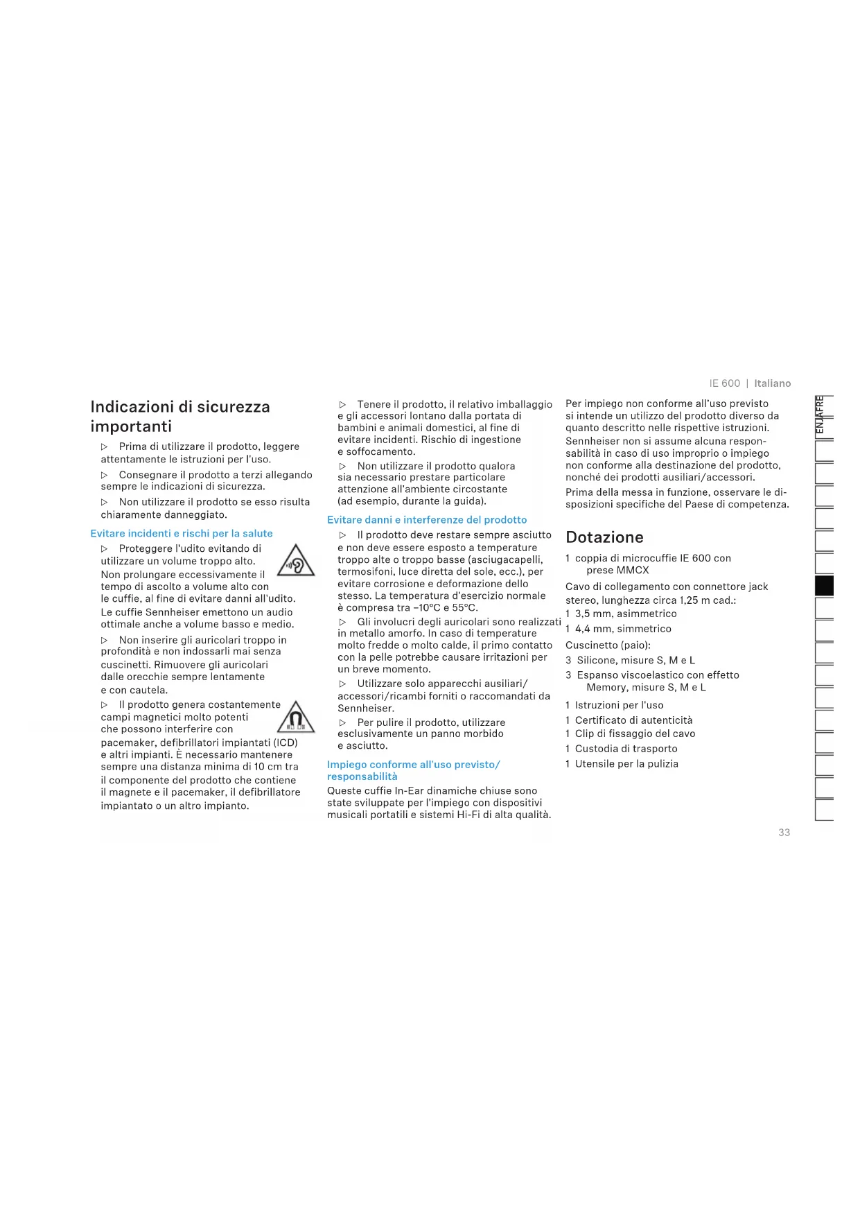 IE 600 | Italiano Indicazioni di sicurezza importanti ▷ Prima di utilizzare il prodotto, leggere attentamente le istruzioni per l'uso. ▷ Consegnare il prodotto a terzi allegando sempre le indicazioni di sicurezza. ▷ Non utilizzare il prodotto se esso risulta chiaramente danneggiato. Evitare incidenti e rischi per la salute ▷ Proteggere l'udito evitando di utilizzare un volume troppo alto. Non prolungare eccessivamente il tempo di ascolto a volume alto con le cuffie, al fine di evitare danni all'udito. Le cuffie Sennheiser emettono un audio ottimale anche a volume basso e medio. ▷ Non inserire gli auricolari troppo in profondità e non indossarli mai senza cuscinetti. Rimuovere gli auricolari dalle orecchie sempre lentamente e con cautela. ▷ Il prodotto genera costantemente campi magnetici molto potenti che possono interferire con pacemaker, defibrillatori impiantati (ICD) e altri impianti. È necessario mantenere sempre una distanza minima di 10 cm tra il componente del prodotto che contiene il magnete e il pacemaker, il defibrillatore impiantato o un altro impianto. ▷ Tenere il prodotto, il relativo imballaggio e gli accessori lontano dalla portata di bambini e animali domestici, al fine di evitare incidenti. Rischio di ingestione e soffocamento. ▷ Non utilizzare il prodotto qualora sia necessario prestare particolare attenzione all'ambiente circostante (ad esempio, durante la guida). Evitare danni e interferenze del prodotto ▷ Il prodotto deve restare sempre asciutto e non deve essere esposto a temperature troppo alte o troppo basse (asciugacapelli, termosifoni, luce diretta del sole, ecc.), per evitare corrosione e deformazione dello stesso. La temperatura d'esercizio normale è compresa tra –10°C e 55°C. ▷ Gli involucri degli auricolari sono realizzati in metallo amorfo. In caso di temperature molto fredde o molto calde, il primo contatto con la pelle potrebbe causare irritazioni per un breve momento. ▷ Utilizzare solo apparecchi ausiliari/ accessori/ricambi forniti o raccomandati da Sennheiser. ▷ Per pulire il prodotto, utilizzare esclusivamente un panno morbido e asciutto. Impiego conforme all'uso previsto/ responsabilità Queste cuffie In-Ear dinamiche chiuse sono state sviluppate per l'impiego con dispositivi musicali portatili e sistemi Hi-Fi di alta qualità. Per impiego non conforme all’uso previsto si intende un utilizzo del prodotto diverso da quanto descritto nelle rispettive istruzioni. Sennheiser non si assume alcuna respon- sabilità in caso di uso improprio o impiego non conforme alla destinazione del prodotto, nonché dei prodotti ausiliari/accessori. Prima della messa in funzione, osservare le di- sposizioni specifiche del Paese di competenza. Dotazione 1 coppia di microcuffie IE 600 con prese MMCX Cavo di collegamento con connettore jack stereo, lunghezza circa 1,25 m cad.: 1 3,5 mm, asimmetrico 1 4,4 mm, simmetrico Cuscinetto (paio): 3 Silicone, misure S, M e L 3 Espanso viscoelastico con effetto Memory, misure S, M e L 1 Istruzioni per l'uso 1 Certificato di autenticità 1 Clip di fissaggio del cavo 1 Custodia di trasporto 1 Utensile per la pulizia34 Italiano | IE 600 Le vostre Sennheiser IE 600 La riproduzione del suono ideale: non alterata e chiara. Le IE 600 sono questo. Microcuffie che raccolgono l'eredità del fiore all'occhiello audiofilo In-Ear Sennheiser IE 900. Basate sui rinomati trasduttori TrueResponse, le IE 600 sono dotate di camere di risonanza "Dual 2 Chamber Absorber", che facilitano la configurazione del suono in un ambiente diretto e focalizzato. La parte vocale passa in primo piano e crea un ponte tra voi e la musica, facendo scomparire il mondo intorno a voi. La riproduzione neutra del suono nel campo comunque impetuoso dei bass profondi mostra di cosa sono capaci i trasduttori dinamici In-Ear da 7 mm grazie all'impiego coerente di ricerca e perizia decennali. La riproduzione bilanciata fornisce toni alti puliti, che non suddividono la musica in modo analitico. Le IE 600 mostrano la passione in Sennheiser di riprodurre il suono ideale e di vivere con la musica un momento personale profondo. Le IE 600 vengono prodotte da un team di esperti presso lo stabilimento specializzato in cuffie a Tullamore, Irlanda. Come per tutte le cuffie audiofile le tolleranze di produzione sono rigorosissime. Ogni trasduttore acustico viene testato completamente, sia singolarmente prima, sia insieme dopo l'accoppiamento del lato destro e sinistro della cuffia. I trasduttori acustici del lato destro e sinistro vengono selezionati per essere sintonizzati in modo ottimale uno con l'altro. I trasduttori acustici sono racchiusi in un involucro con una forma mai esistita prima per delle microcuffie audiofile. Grazie alla fusione laser selettiva, l’involucro è stato trasformato strato per strato in un metallo con strutture amorfe. Il risultato è un materiale estremamente duro, resistente agli influssi ambientali, che grazie alle sue caratteristiche e alla produzione complessa è stato utilizzato principalmente nella navigazione spaziale e nella tecnica medicale. Tra l’altro, la superficie ruvida metallica della lega in niobio-alluminio- rame-zirconio è un vero richiamo visivo. Le IE 600 offrono una connettività eccellente grazie ai collegamenti MMCX Fidelity+. Questi connettori di precisione sono stati ottimizzati per l'utilizzo mobile delle microcuffie. Grazie all'alto rivestimento dei connettori ,i contatti a filigrana sono ottimamente protetti dal carico meccanico. Sul lato dispositivo sono disponibili di serie connettori jack da 3,5 mm e 4,4 mm. Il passaggio dei cavi sopra l'orecchio con archetti regolabili assicura un'indossabilità leggera e rumori intrinseci ridotti rispetto ai cavi standard. In questo modo, le straordinarie microcuffie Sennheiser IE 600 consentono di godere di sessioni di ascolto anche prolungate. Le figure sono riportate nella pagina pieghevole.