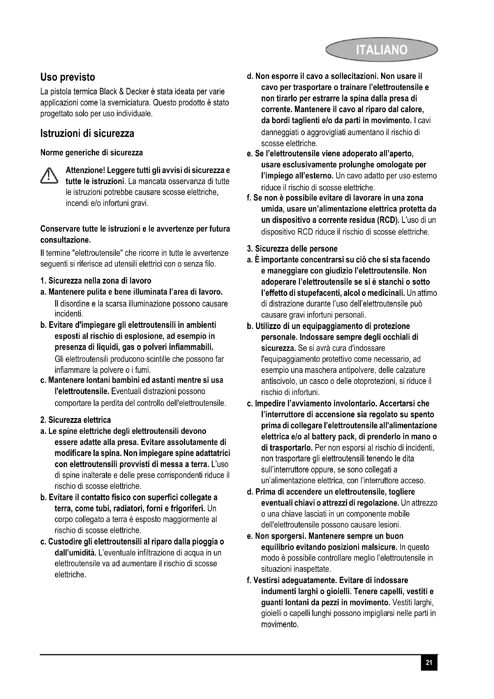a. Fare riparare l'elettroutensile solo ed esclusivamente da personale specializzato e solo impiegando pezzi di ricambio originali, onde non alterarne la sicurezza. Ulteriori avvisi di sicurezza Attenzione! Non usare all'aperto, solo per utilizzo all'interno. Attenzione! Questo elettroutensile non è stato progettato per impiego da parte di persone (o bambini) portatrici di handicap fisici, psichici o sensoriali o che non abbiano la dovuta esperienza o conoscenza, a meno che non siano seguite o opportunamente istruite sul suo impiego da parte di una persona responsabile della loro sicurezza. Attenzione! Sorvegliare i bambini per evitare che giochino con l'elettroutensile. Attenzione! Quando non è utilizzato, l’elettroutensile deve essere appoggiato sul proprio supporto. Attenzione! Se l’elettroutensile non è usato con la dovuta attenzione, potrebbe provocare un incendio. Prestare quindi sempre la massima attenzione quando lo si usa in luoghi dove vi sono materiali combustibili. X Non riscaldare la medesima posizione per un lungo periodo di tempo. X Non usare in ambienti esposti al rischio di esplosione. X Tenere presente che il calore potrebbe raggiungere materiali combustibili che non sono in vista. X Appoggiare l’elettroutensile sulla propria base dopo l’impiego e lasciare che si raffreddi prima di riporlo. X Non lasciare incustodito l’elettroutensile quando è acceso. X Non ostruire le fessure delle prese d’aria o l’uscita dell’ugello per non causare un accumulo eccessivo di calore che potrebbe danneggiare l’elettroutensile. X Non puntare il flusso di aria calda contro altre persone o animali. X Non toccare l’ugello dato che diventa molto caldo durante l’impiego e rimane caldo anche per 30 minuti dopo l’uso. X Non appoggiare l’ugello contro altri oggetti durante o immediatamente dopo l’uso. X Non infilare nulla nell’ugello in quanto si potrebbe subire una scossa elettrica. X Non guardare direttamente dentro all’ugello quando l’elettroutensile è acceso. X Non usare l’elettroutensile come se fosse un asciugacapelli! La temperatura dell’aria è molto più elevata di quella di un asciugacapelli. X Accertarsi che vi sia una ventilazione adeguata durante l’impiego dato che si può verificare l’esalazione di fumi tossici. X Non usare l’elettroutensile in ambienti umidi. Attenzione! Ulteriori precauzioni di sicurezza per le pistole termiche. !23 ITALIANO X Quando si esegue la sverniciatura, accertarsi che la zona di lavoro sia racchiusa. Indossare una mascherina antipolvere specifica per polveri di vernice a base di piombo e fumi e controllare che anche le persone presenti o in arrivo nell'area di lavoro siano adeguatamente protette. X Non bruciare la vernice, dato che potrebbe causare un incendio. X Non lasciare che la vernice aderisca all’ugello dato che potrebbe incendiarsi dopo un po’ di tempo. X Spegnere l’elettroutensile e lasciare che si raffreddi prima di montare gli accessori. Sverniciatura di vernici a base di piombo X Prestare la massima attenzione quando si esegue la sverniciatura. I trucioli, i residui e i vapori di vernice possono contenere piombo che è velenoso. Qualsiasi edificio costruito prima del 1960 potrebbe essere stato verniciato con vernice contenente piombo. E la vernice originale potrebbe essere stata coperta da strati addizionali di vernice. Quando è depositato sulle superfici, il contatto mani bocca può risultare nell’ingestione di piombo. X L’esposizione a livelli anche bassi di piombo può causare danni irreparabili al cervello e al sistema nervoso. Bambini e donne incinte sono maggiormente a rischio di avvelenamento da piombo. X Prima di iniziare il lavoro, è importante determinare se la vernice da sverniciare contiene piombo. Per farlo usare un kit di prova o rivolgersi a un decoratore professionista. Non fumare, mangiare o bere in una zona di lavoro che può o potrebbe essere contaminata dal piombo. Le vernici a base di piombo devono essere asportate solo da un professionista e non devono essere sverniciate con pistola termica. Etichette Sicurezza elettrica X In caso di danneggiamento del filo di alimentazione, è necessario farlo riparare dal fabbricante o presso un centro assistenza Black & Decker autorizzato in modo da evitare eventuali pericoli. Cavi di prolunga X Usare un cavo a 2 o a 3 conduttori dato che l’elettroutensile ha un doppio isolamento ed è di classe II. X È possibile usare un cavo lungo 30 m senza che si verifichi una perdita di potenza. Caratteristiche