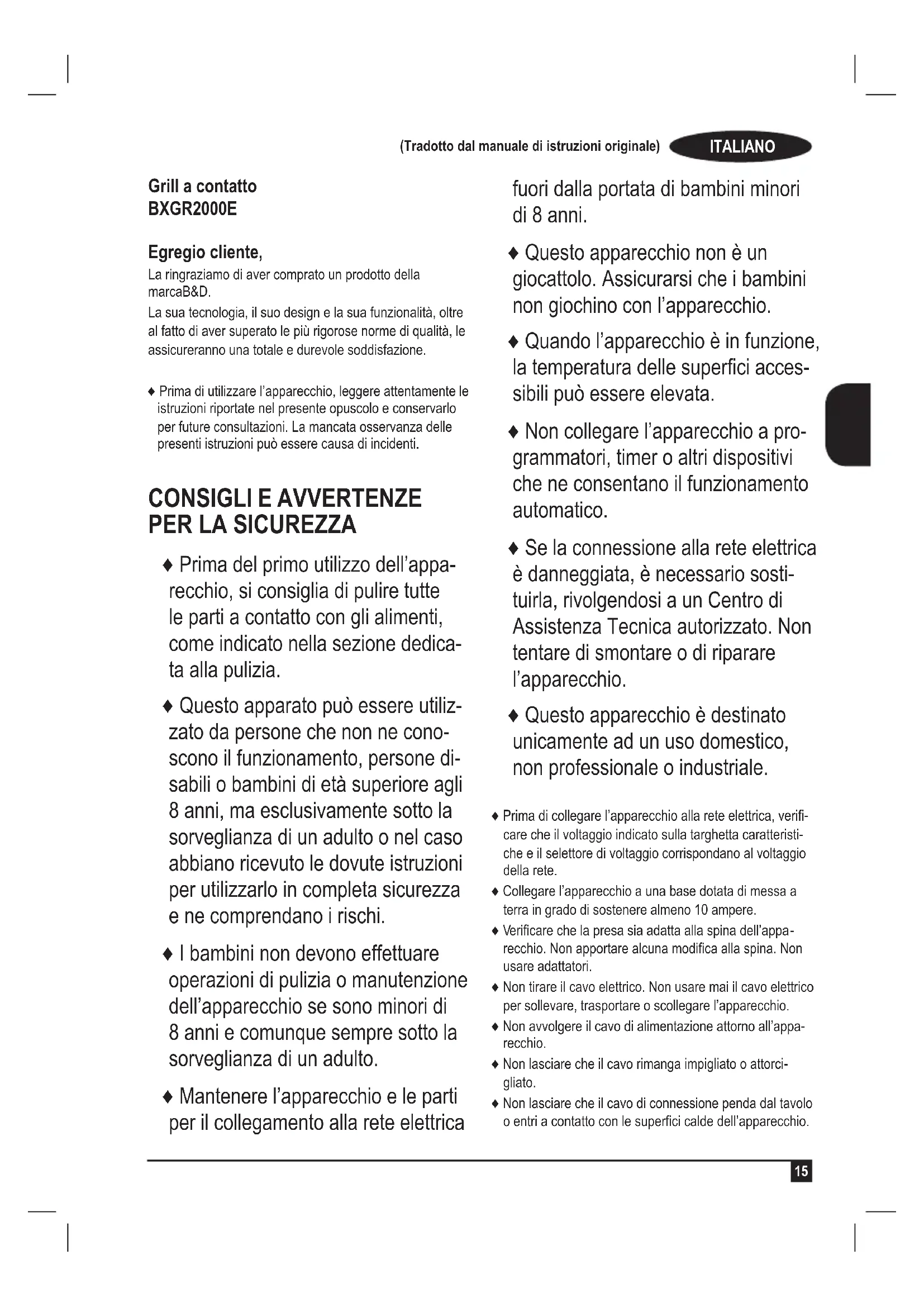 Grill a contatto BXGR2000E Egregio cliente, La ringraziamo di aver comprato un prodotto della marcaB&D. La sua tecnologia, il suo design e la sua funzionalità, oltre al fatto di aver superato le più rigorose norme di qualità, le assicureranno una totale e durevole soddisfazione. ♦ Prima di utilizzare l’apparecchio, leggere attentamente le istruzioni riportate nel presente opuscolo e conservarlo per future consultazioni. La mancata osservanza delle presenti istruzioni può essere causa di incidenti.