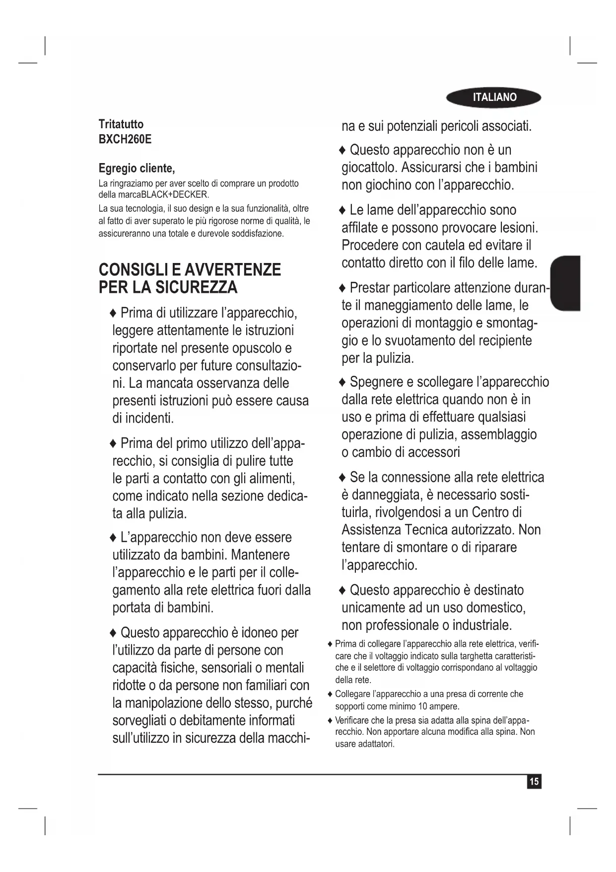 Tritatutto BXCH260E Egregio cliente, La ringraziamo per aver scelto di comprare un prodotto della marcaBLACK+DECKER. La sua tecnologia, il suo design e la sua funzionalità, oltre al fatto di aver superato le più rigorose norme di qualità, le assicureranno una totale e durevole soddisfazione.