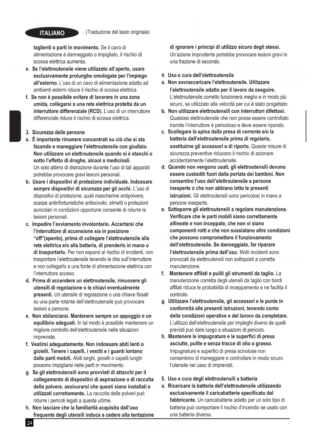 a. Le spine elettriche degli elettroutensili devono essere adatte alla presa di corrente. Non modicare la spina in alcun modo. Non utilizzare spine con adattatore con gli elettroutensili dotati di messa a terra. Per ridurre il rischio di scossa elettrica evitare di modicare le spine e utilizzare sempre le prese di corrente appropriate. b. Evitare il contatto sico con superci collegate a terra, quali tubi, radiatori, forni e frigoriferi. Se il proprio corpo è collegato a terra, il rischio di scossa elettrica aumenta. c. Custodire gli elettroutensili al riparo dalla pioggia o dall’umidità. Se penetra dell’acqua all’interno dell’elettroutensile, il rischio di scosse elettriche aumenta. d. Non utilizzare il cavo di alimentazione in modo improprio. Non usare il cavo di alimentazione per trasportare o trainare l’elettroutensile e non tirarlo per estrarre la spina dalla presa di corrente. Tenere il cavo di alimentazione lontano da fonti di calore, olio, bordi24 (Traduzione del testo originale) ITALIANO taglienti o parti in movimento. Se il cavo di alimentazione è danneggiato o impigliato, il rischio di scossa elettrica aumenta. e. Se l’elettroutensile viene utilizzato all’aperto, usare esclusivamente prolunghe omologate per l’impiego all’esterno. L’uso di un cavo di alimentazione adatto ad ambienti esterni riduce il rischio di scossa elettrica. f. Se non è possibile evitare di lavorare in una zona umida, collegarsi a una rete elettrica protetta da un interruttore differenziale (RCD). L’uso di un interruttore differenziale riduce il rischio di scossa elettrica.