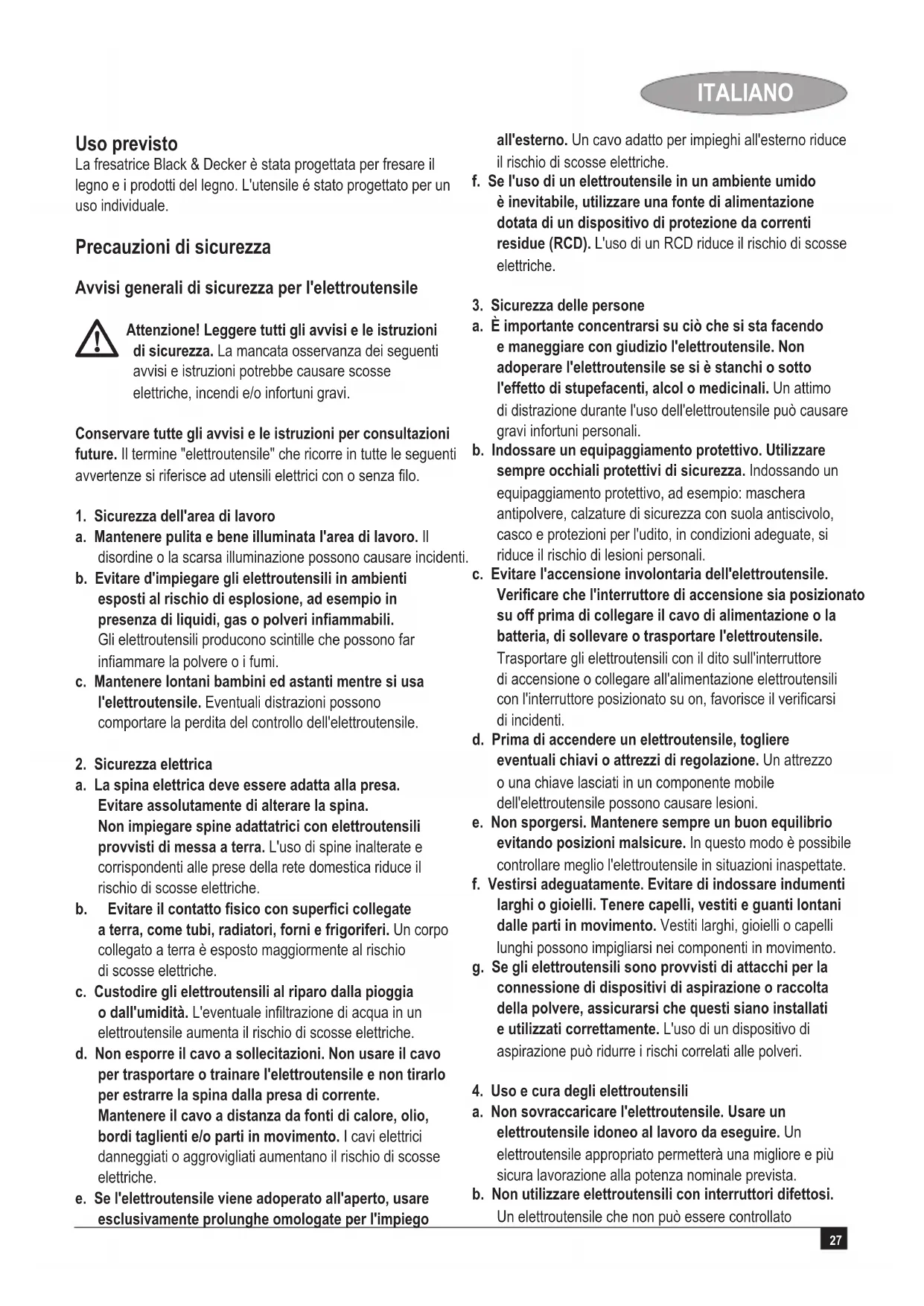 Attenzione! Per ridurre il rischio di lesioni, l'utente è tenuto a leggere il presente manuale di istruzioni. Sicurezza elettrica