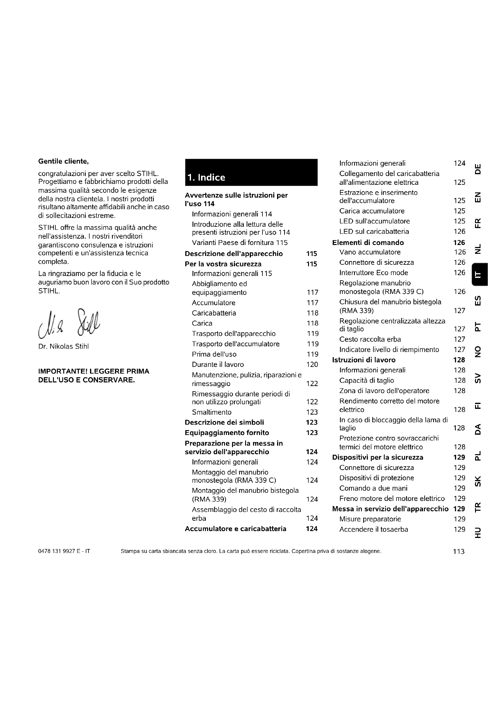 Avvertenze sulle istruzioni per l’uso 114 Informazioni generali 114 Introduzione alla lettura delle presenti istruzioni per l’uso 114 Varianti Paese di fornitura 115 Descrizione dell’apparecchio 115 Per la vostra sicurezza 115 Informazioni generali 115 Abbigliamento ed equipaggiamento 117 Accumulatore 117 Caricabatteria 118 Carica 118 Trasporto dell'apparecchio 119 Trasporto dell'accumulatore 119 Prima dell'uso 119 Durante il lavoro 120 Manutenzione, pulizia, riparazioni e rimessaggio 122 Rimessaggio durante periodi di non utilizzo prolungati 122 Smaltimento 123 Descrizione dei simboli 123 Equipaggiamento fornito 123 Preparazione per la messa in servizio dell'apparecchio 124 Informazioni generali 124 Montaggio del manubrio monostegola (RMA 339 C) 124 Montaggio del manubrio bistegola (RMA 339) 124 Assemblaggio del cesto di raccolta erba 124 Accumulatore e caricabatteria 124 Informazioni generali 124 Collegamento del caricabatteria all'alimentazione elettrica 125 Estrazione e inserimento dell'accumulatore 125 Carica accumulatore 125 LED sull'accumulatore 125 LED sul caricabatteria 126 Elementi di comando 126 Vano accumulatore 126 Connettore di sicurezza 126 Interruttore Eco mode 126 Regolazione manubrio monostegola (RMA 339 C) 126 Chiusura del manubrio bistegola (RMA 339) 127 Regolazione centralizzata altezza di taglio 127 Cesto raccolta erba 127 Indicatore livello di riempimento 127 Istruzioni di lavoro 128 Informazioni generali 128 Capacità di taglio 128 Zona di lavoro dell'operatore 128 Rendimento corretto del motore elettrico 128 In caso di bloccaggio della lama di taglio 128 Protezione contro sovraccarichi termici del motore elettrico 128 Dispositivi per la sicurezza 129 Connettore di sicurezza 129 Dispositivi di protezione 129 Comando a due mani 129 Freno motore del motore elettrico 129 Messa in servizio dell'apparecchio 129 Misure preparatorie 129 Accendere il tosaerba 1290478 131 9927 E - IT