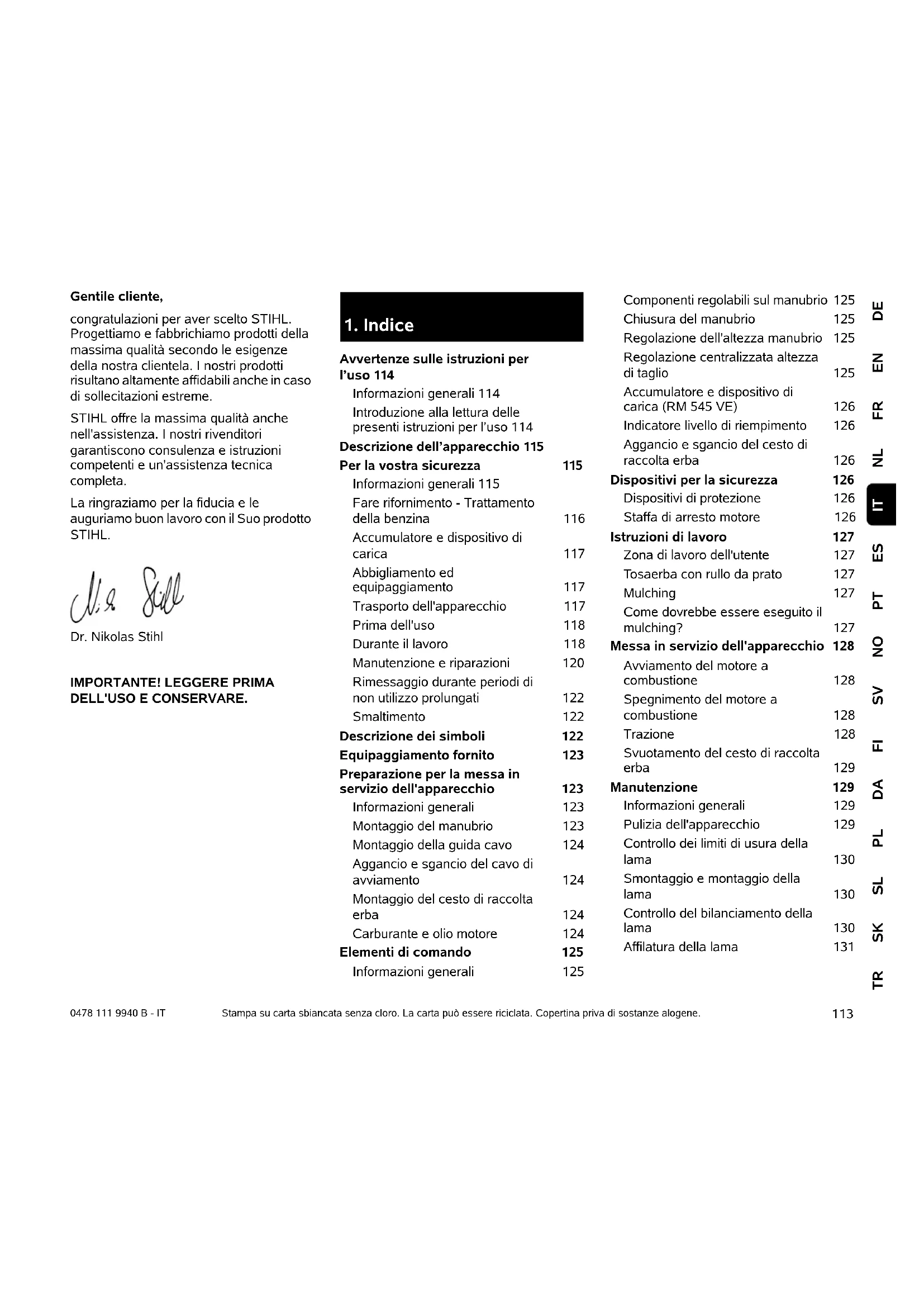 DEENFRNLESPTNOSVFIDAPLSLSKTR IT 0478 111 9940 B - IT Gentile cliente, congratulazioni per aver scelto STIHL. Progettiamo e fabbrichiamo prodotti della massima qualità secondo le esigenze della nostra clientela. I nostri prodotti risultano altamente affidabili anche in caso di sollecitazioni estreme. STIHL offre la massima qualità anche nell'assistenza. I nostri rivenditori garantiscono consulenza e istruzioni competenti e un'assistenza tecnica completa. La ringraziamo per la fiducia e le auguriamo buon lavoro con il Suo prodotto STIHL. Dr. Nikolas Stihl