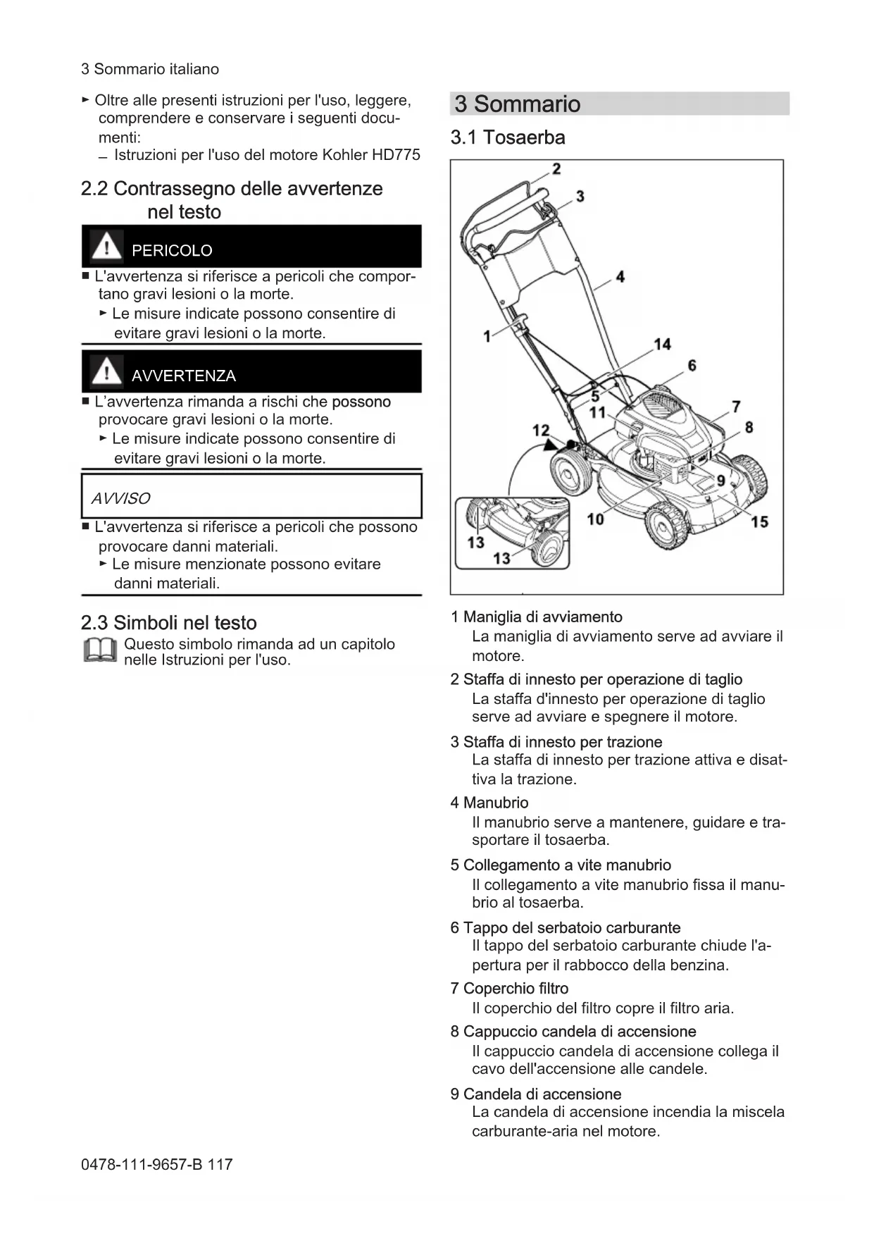 1 Maniglia di avviamento La maniglia di avviamento serve ad avviare il motore. 2 Staffa di innesto per operazione di taglio La staffa d'innesto per operazione di taglio serve ad avviare e spegnere il motore. 3 Staffa di innesto per trazione La staffa di innesto per trazione attiva e disat‐ tiva la trazione. 4 Manubrio Il manubrio serve a mantenere, guidare e tra‐ sportare il tosaerba. 5 Collegamento a vite manubrio Il collegamento a vite manubrio fissa il manu‐ brio al tosaerba. 6 Tappo del serbatoio carburante Il tappo del serbatoio carburante chiude l'a‐ pertura per il rabbocco della benzina. 7 Coperchio filtro Il coperchio del filtro copre il filtro aria. 8 Cappuccio candela di accensione Il cappuccio candela di accensione collega il cavo dell'accensione alle candele. 9 Candela di accensione La candela di accensione incendia la miscela carburante-aria nel motore. 3 Sommario italiano 0478-111-9657-B 11710 Silenziatore Il silenziatore riduce le emissioni sonore del tosaerba. 11 Tappo di chiusura olio motore Il tappo di chiusura olio motore chiude l'aper‐ tura per il rabbocco dell'olio motore. 12 Leva La leva serve a regolare l'altezza di taglio. 13 Paraolio ruota Il paraolio ruota serve per pulire le ruote posteriori. 14 Impugnatura per il trasporto posteriore L'impugnatura per il trasporto serve a traspor‐ tare il tosaerba. 15 Impugnatura per il trasporto anteriore L'impugnatura per il trasporto serve a traspor‐ tare il tosaerba.