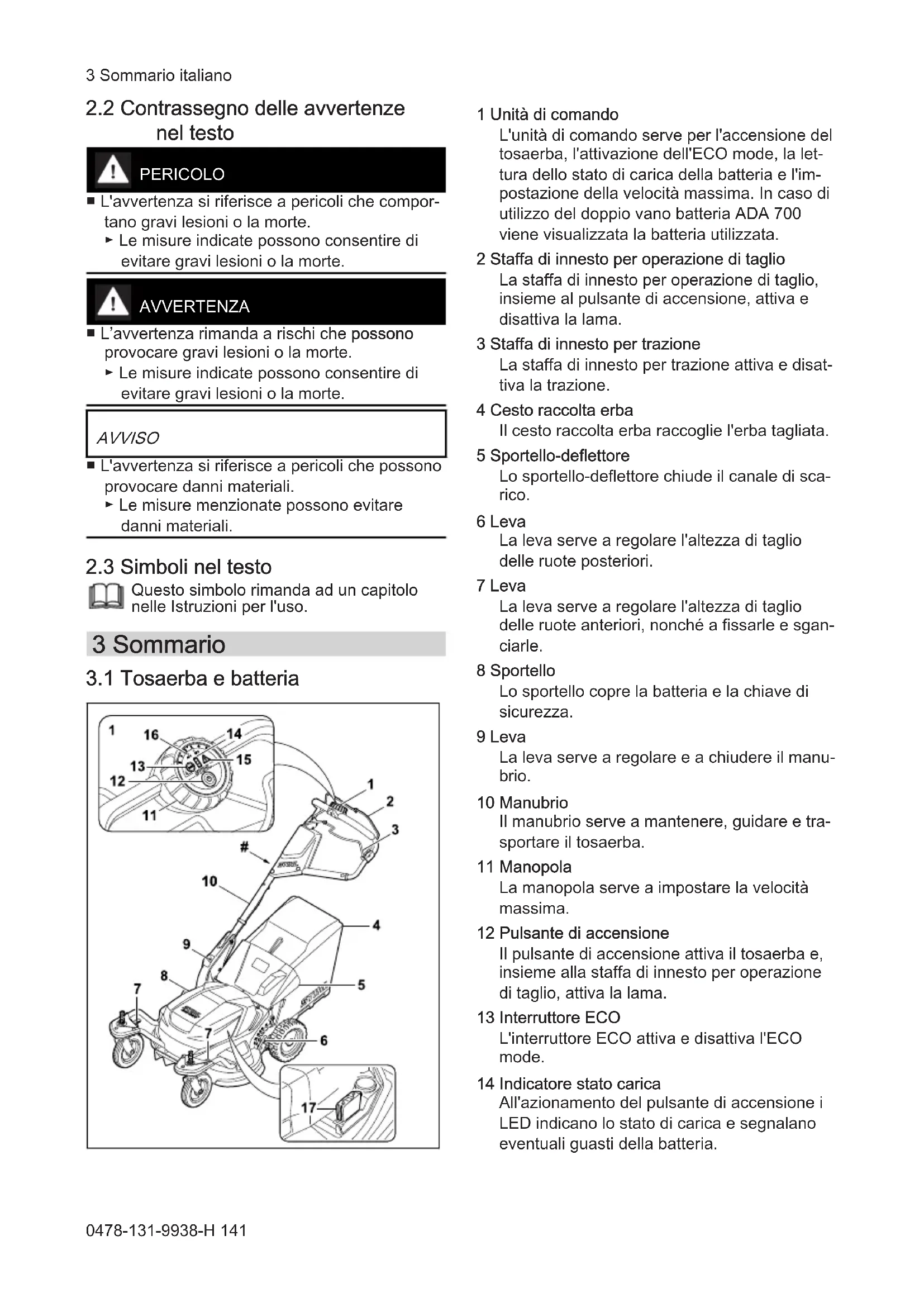 1 Unità di comando L'unità di comando serve per l'accensione del tosaerba, l'attivazione dell'ECO mode, la let‐ tura dello stato di carica della batteria e l'im‐ postazione della velocità massima. In caso di utilizzo del doppio vano batteria ADA 700 viene visualizzata la batteria utilizzata. 2 Staffa di innesto per operazione di taglio La staffa di innesto per operazione di taglio, insieme al pulsante di accensione, attiva e disattiva la lama. 3 Staffa di innesto per trazione La staffa di innesto per trazione attiva e disat‐ tiva la trazione. 4 Cesto raccolta erba Il cesto raccolta erba raccoglie l'erba tagliata. 5 Sportello-deflettore Lo sportello-deflettore chiude il canale di sca‐ rico. 6 Leva La leva serve a regolare l'altezza di taglio delle ruote posteriori. 7 Leva La leva serve a regolare l'altezza di taglio delle ruote anteriori, nonché a fissarle e sgan‐ ciarle. 8 Sportello Lo sportello copre la batteria e la chiave di sicurezza. 9 Leva La leva serve a regolare e a chiudere il manu‐ brio. 10 Manubrio Il manubrio serve a mantenere, guidare e tra‐ sportare il tosaerba. 11 Manopola La manopola serve a impostare la velocità massima. 12 Pulsante di accensione Il pulsante di accensione attiva il tosaerba e, insieme alla staffa di innesto per operazione di taglio, attiva la lama. 13 Interruttore ECO L'interruttore ECO attiva e disattiva l'ECO mode. 14 Indicatore stato carica All'azionamento del pulsante di accensione i LED indicano lo stato di carica e segnalano eventuali guasti della batteria. 3 Sommario italiano 0478-131-9938-H 14115 Triangolo di segnalazione Il triangolo di segnalazione indica la presenza di guasti nel tosaerba. 16 Indicatore per il doppio vano batteria ADA 700 I LED indicano la batteria attualmente utiliz‐ zata. 17 Chiave di sicurezza La chiave di sicurezza attiva il tosaerba. # Targhetta dati prestazioni con numero di macchina