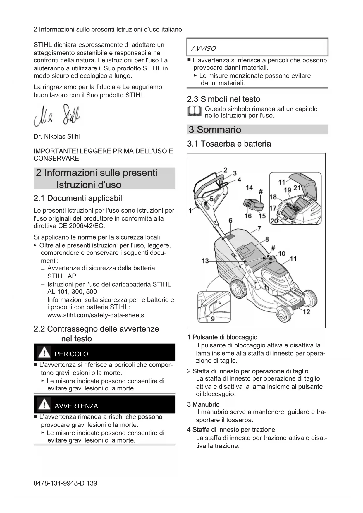 - 26 Avvertenze di sicurezza per il tosaerba 1 Premessa Gentile cliente, congratulazioni per aver scelto STIHL. Proget‐ tiamo e fabbrichiamo prodotti della massima qualità secondo le esigenze della nostra clien‐ tela. I nostri prodotti risultano altamente affidabili anche in caso di sollecitazioni estreme. STIHL offre la massima qualità anche nell'assi‐ stenza. I nostri rivenditori garantiscono consu‐ lenza e istruzioni competenti e un'assistenza tec‐ nica completa. italiano 138 0478-131-9948-D © ANDREAS STIHL AG & Co. KG 2021 0478-131-9948-D. VA1.L21. Stampato su carta candeggiata senza cloro. I colori di stampa contengono oli vegetali; la carta è riciclabile. Traduzione delle istruzioni per l'uso originali 0000009423_004_ISTIHL dichiara espressamente di adottare un atteggiamento sostenibile e responsabile nei confronti della natura. Le istruzioni per l'uso La aiuteranno a utilizzare il Suo prodotto STIHL in modo sicuro ed ecologico a lungo. La ringraziamo per la fiducia e Le auguriamo buon lavoro con il Suo prodotto STIHL. Dr. Nikolas Stihl p. 160