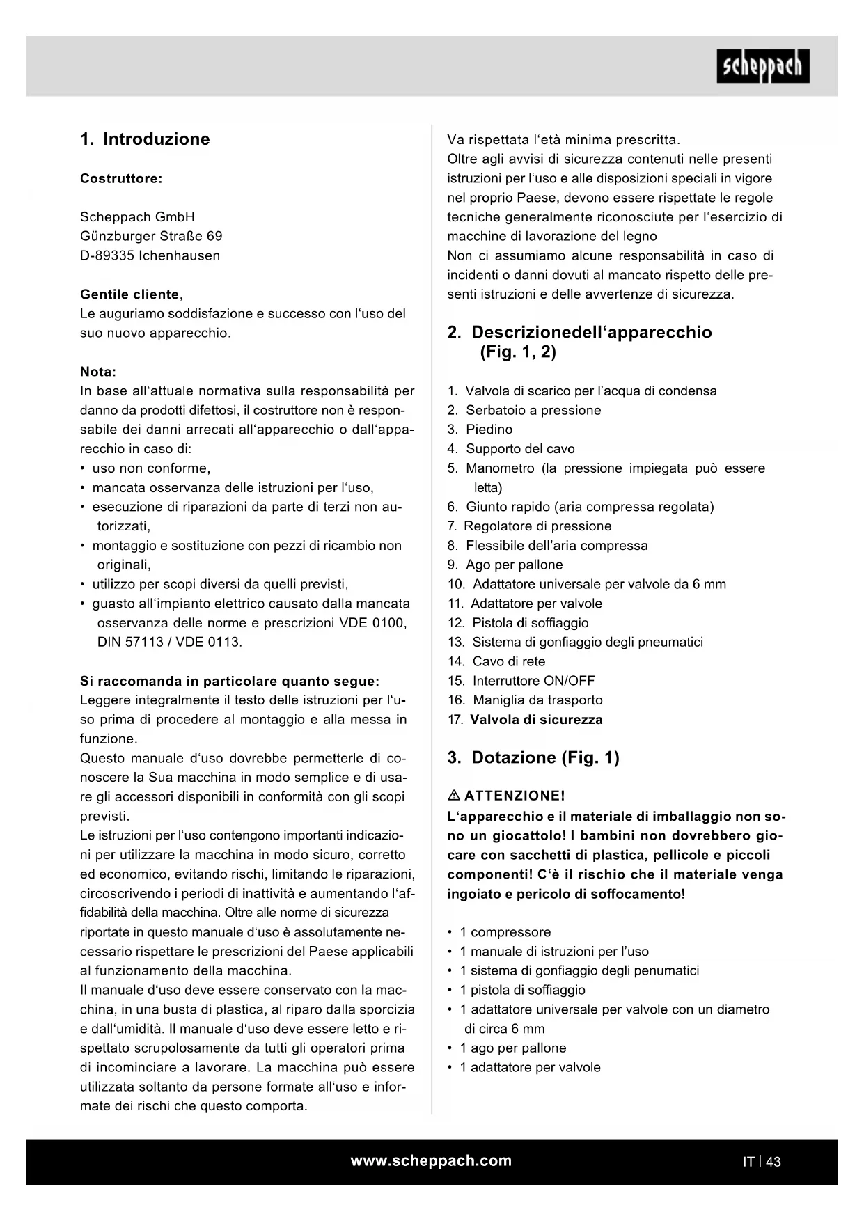 Costruttore: Scheppach GmbH Günzburger Straße 69 D-89335 Ichenhausen Gentile cliente, Le auguriamo soddisfazione e successo con l‘uso del suo nuovo apparecchio. Nota: In base all‘attuale normativa sulla responsabilità per danno da prodotti difettosi, il costruttore non è respon- sabile dei danni arrecati all‘apparecchio o dall‘appa- recchio in caso di: