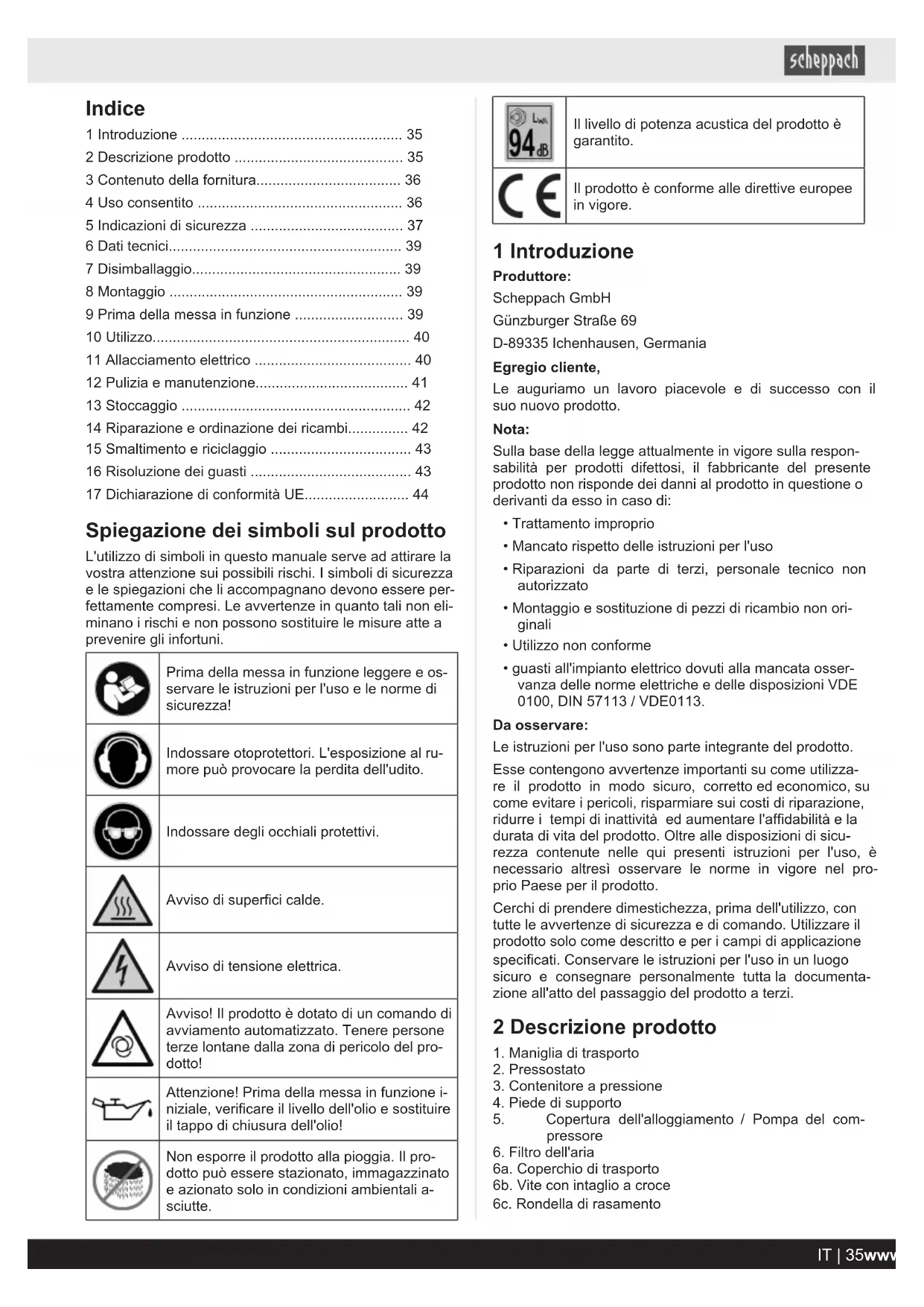 - 91,8 dB Organisme notifié: TÜV SÜD Industrie Service GmbH Westendstrasse 199 80686 Munich Allemagne Numéro: 0036 Responsable de la documentation: Ann-KatrinBloching Günzburger Str. 69 D-89335 Ichenhausen Ichenhausen, 30.06.2025 Simon Schunk Division Manager Product Center Andreas Pecher Head of Project Management 34 | FR www.scheppach.comIndice 1 Introduzione p. 35