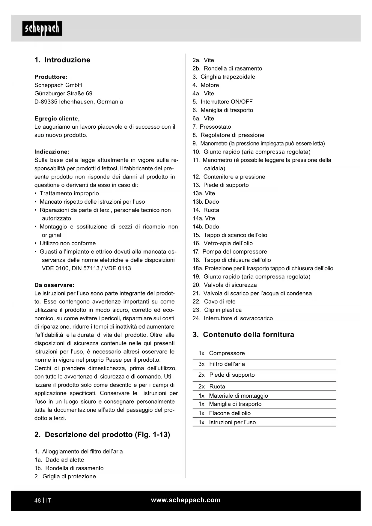 1x Compressore 3x Filtro dell'aria 2x Piede di supporto 2x Ruota 1x Materiale di montaggio 1x Maniglia di trasporto 1x Flacone dell'olio 1x Istruzioni per l'usowww.scheppach.com